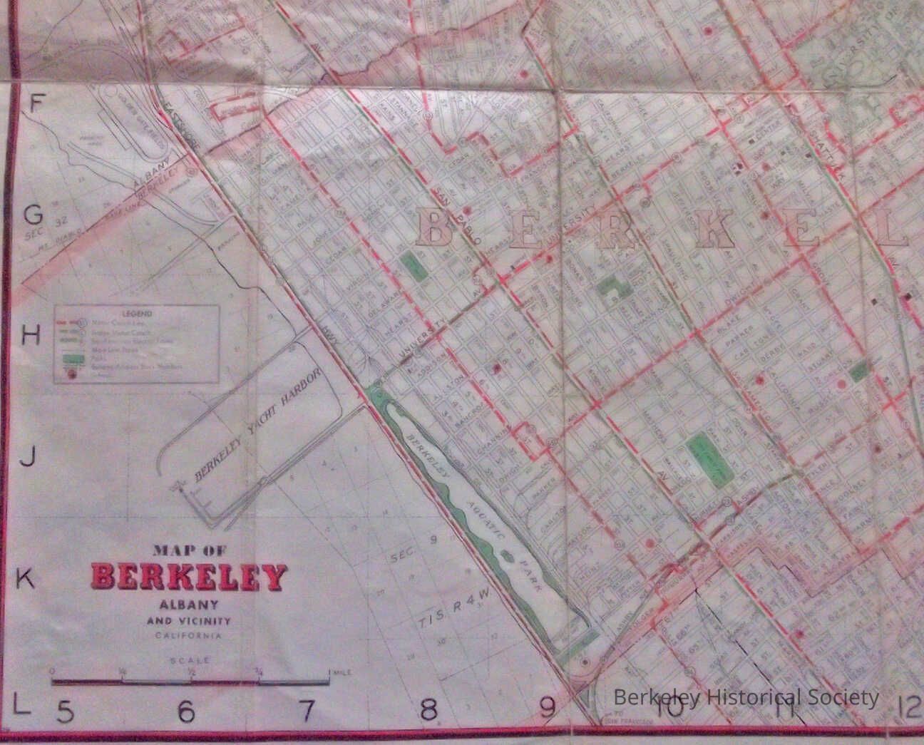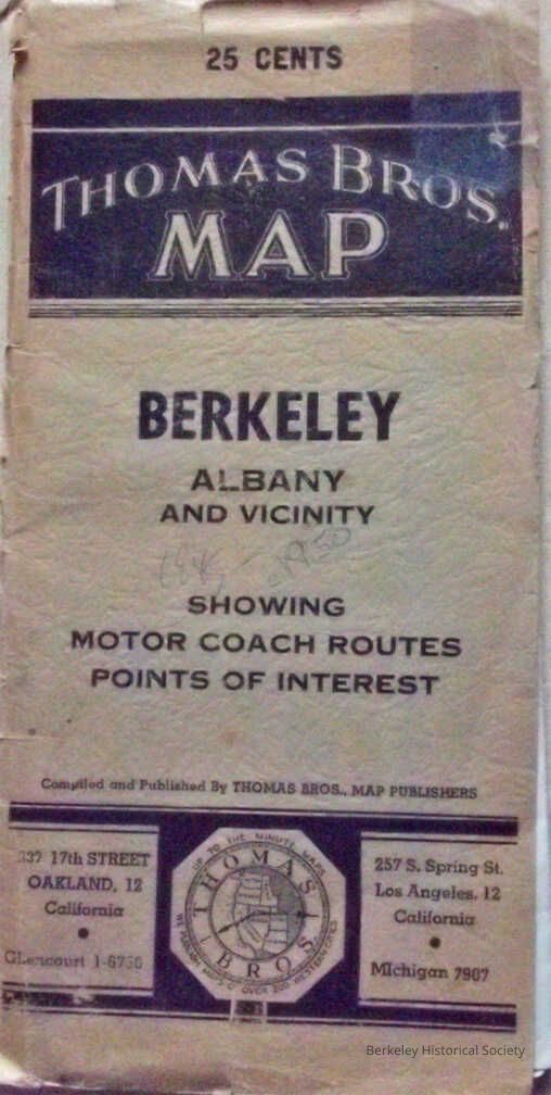 Street Map with Motor Coach and Trains. The map has no date and is approximated between 1945 and 1950. Eastshore Hwy, Map is pasted into a folding thin cardboard. 2 copies
