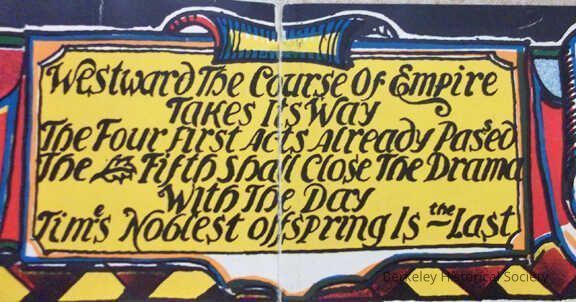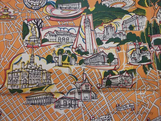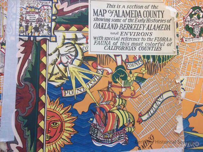 Very colorful and whimsical map. Map comes in its own paper folder, also colorful. Designed by Michael Baltekal-Goodman in collaboration with Eugene Neuhaus. The Sather Gate Bookshop. Union Litho. S.F.G. Oakland.