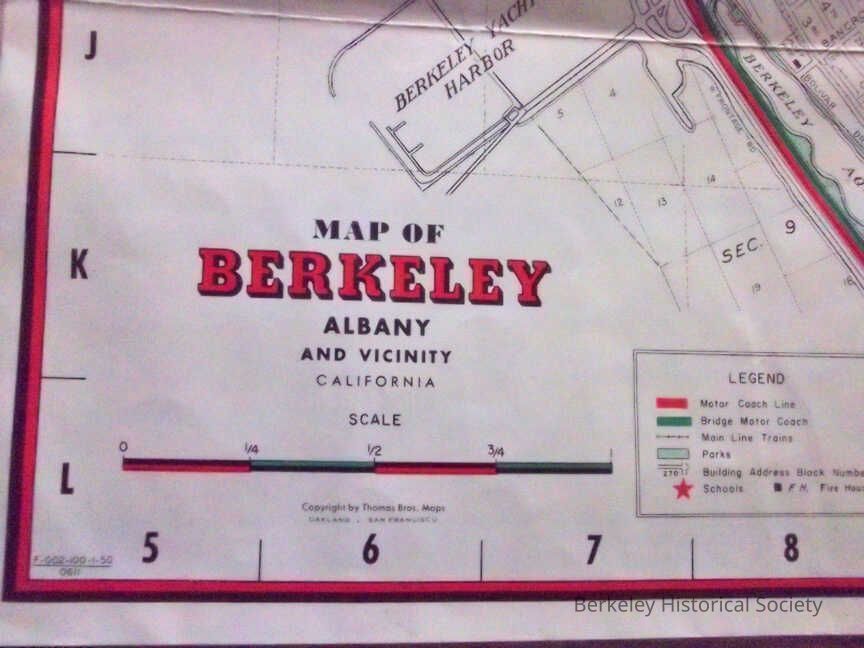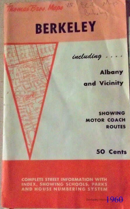 Street map of Berkelely showing motor coach line, bridge motor coach, Main line trains. Map is pasted to a folded cover, with Berkeley map on one side and Thomas Bros products on the other.