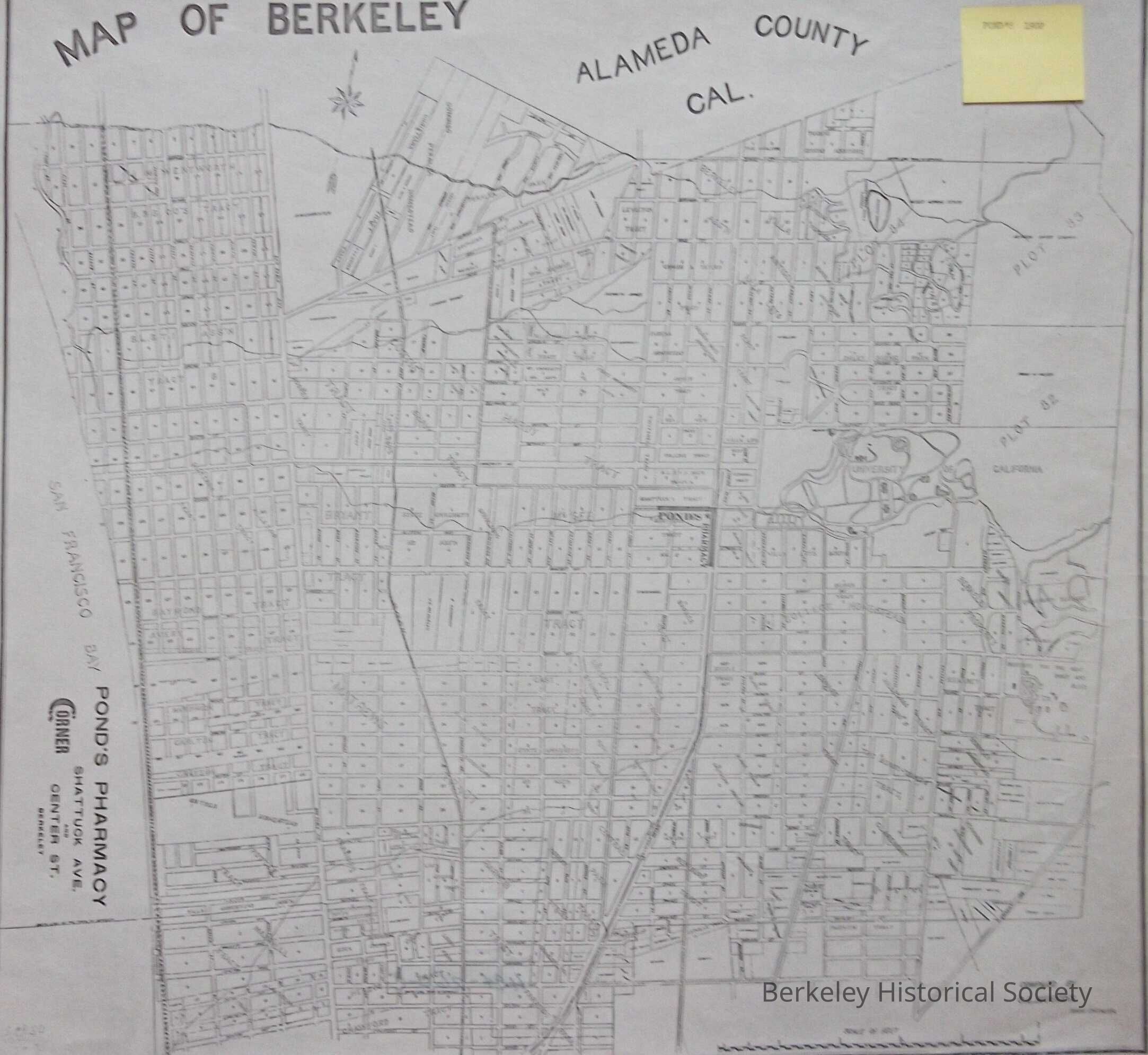 Map bears name of Pond's Pharmacy, Shattuck Ave. and Center St. Location indicated in red on original map