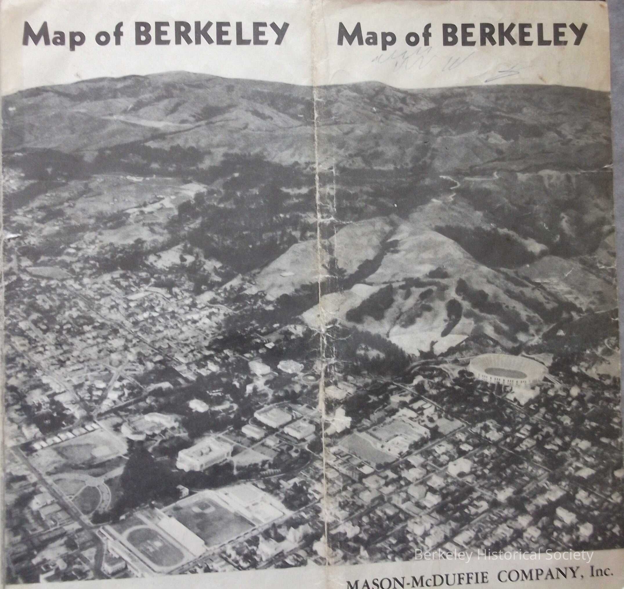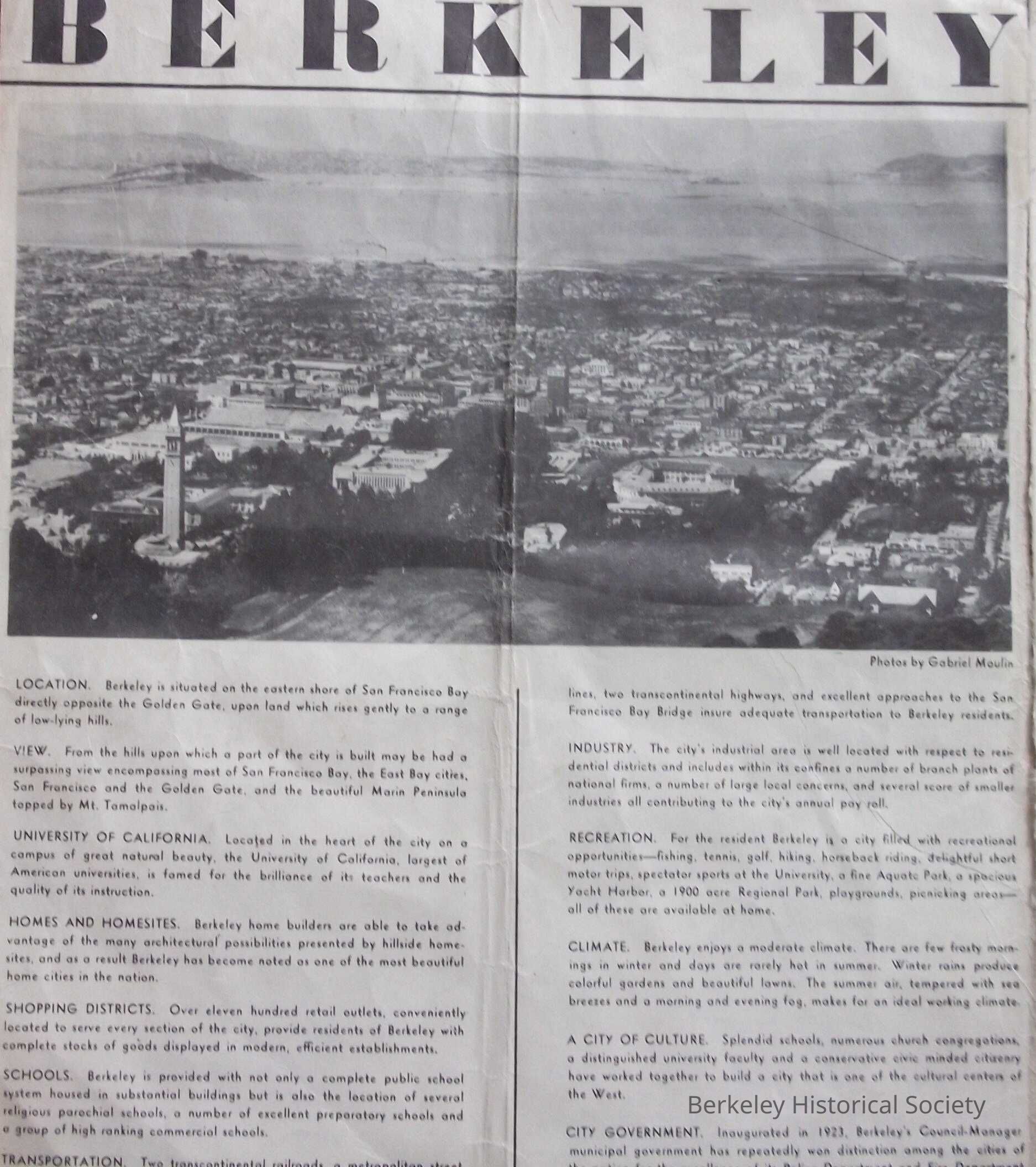 In cooperation with the City/County, Berkeley Realty Board. Photos are by Gabriel Moulin. Advertisers Mason-McDuffie Co., and Berkeley Guarantee Building and Loan Assoc, Inset road Map of Bay Area, photos of Berkeley attractions and description of various Berkeley features such as climate, industry, culture, accessibility to San Francisco and World's Fair.