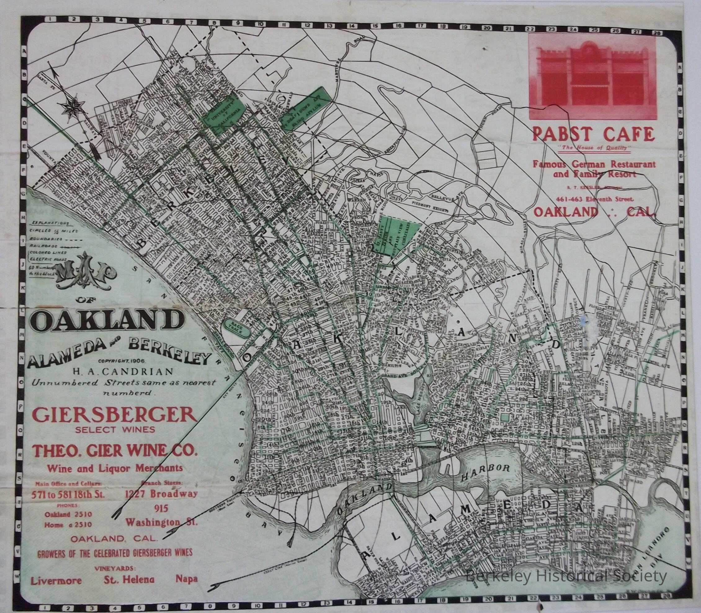 Has advertising for Giersberger Select Wines, Theo Gier Wine Co., Pabst Cafe of Oakland.