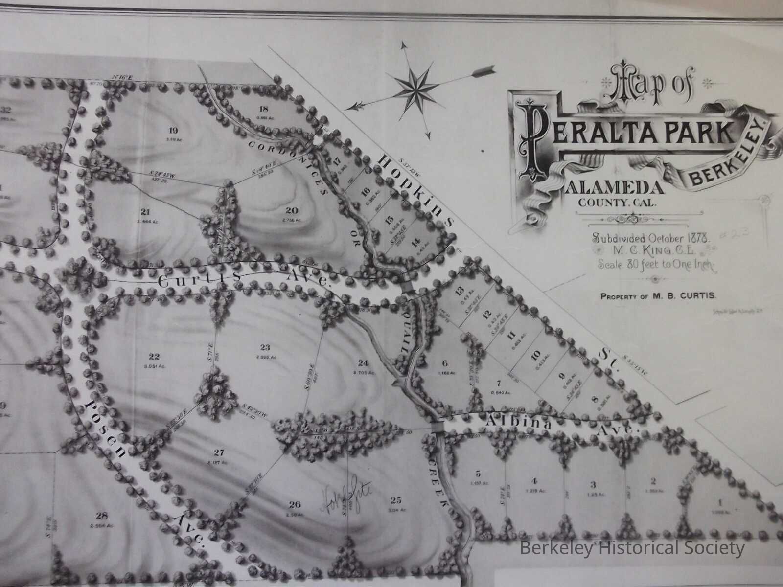 Shows lots (with dimensions, acreage), Codornices Creek, Hopkins Street, Albina Avenue, Curtis Avenue (now Monterey) and Posen Avenue. Pictorial, illustrated with trees and vague contour indication. Hotel site indicated.
