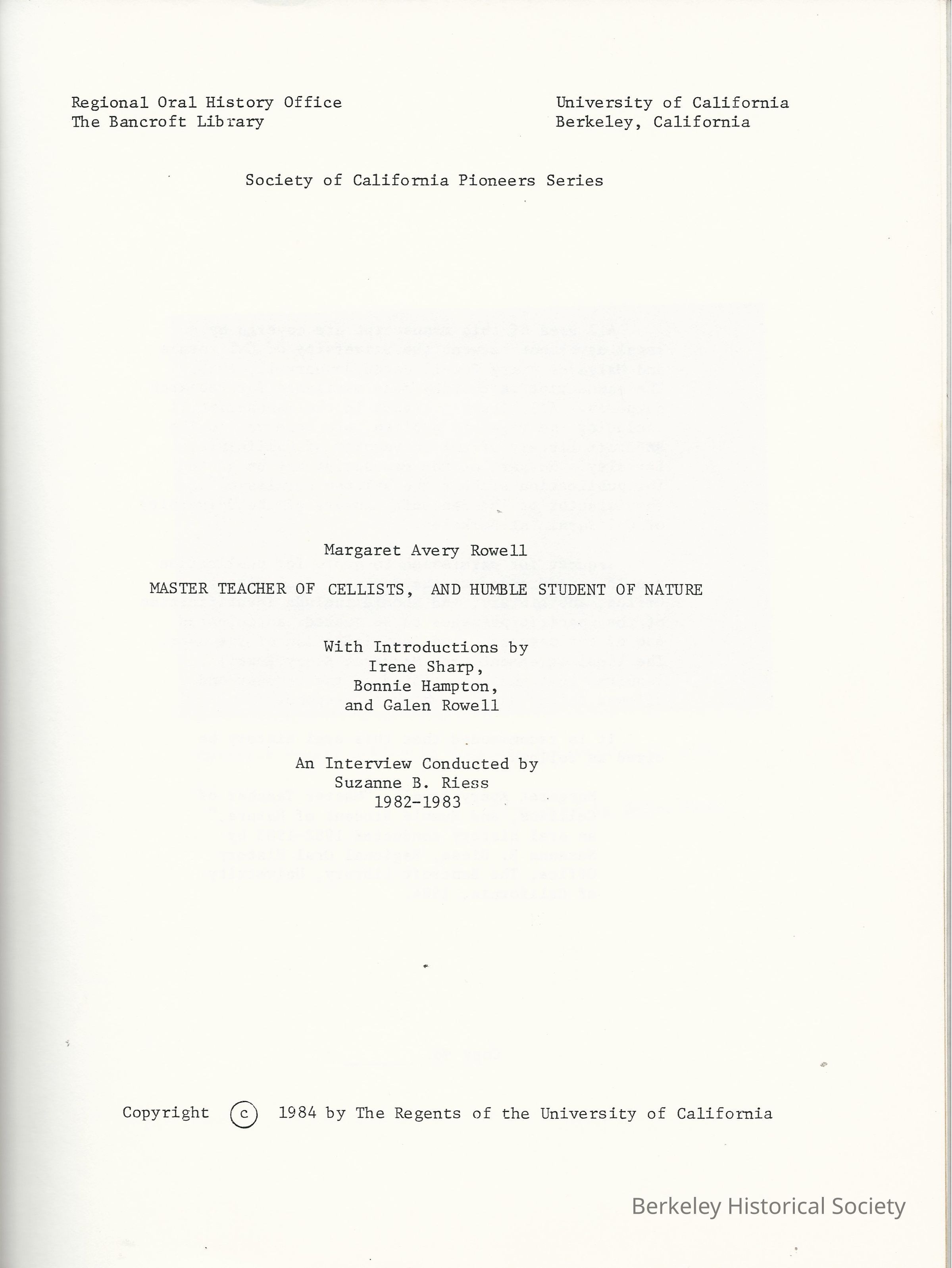 Margaret Avery Rowell, master teacher of cellists, and humble student of nature : an interview / conducted by Suzanne B. Riess 1982-1983.Publication Details