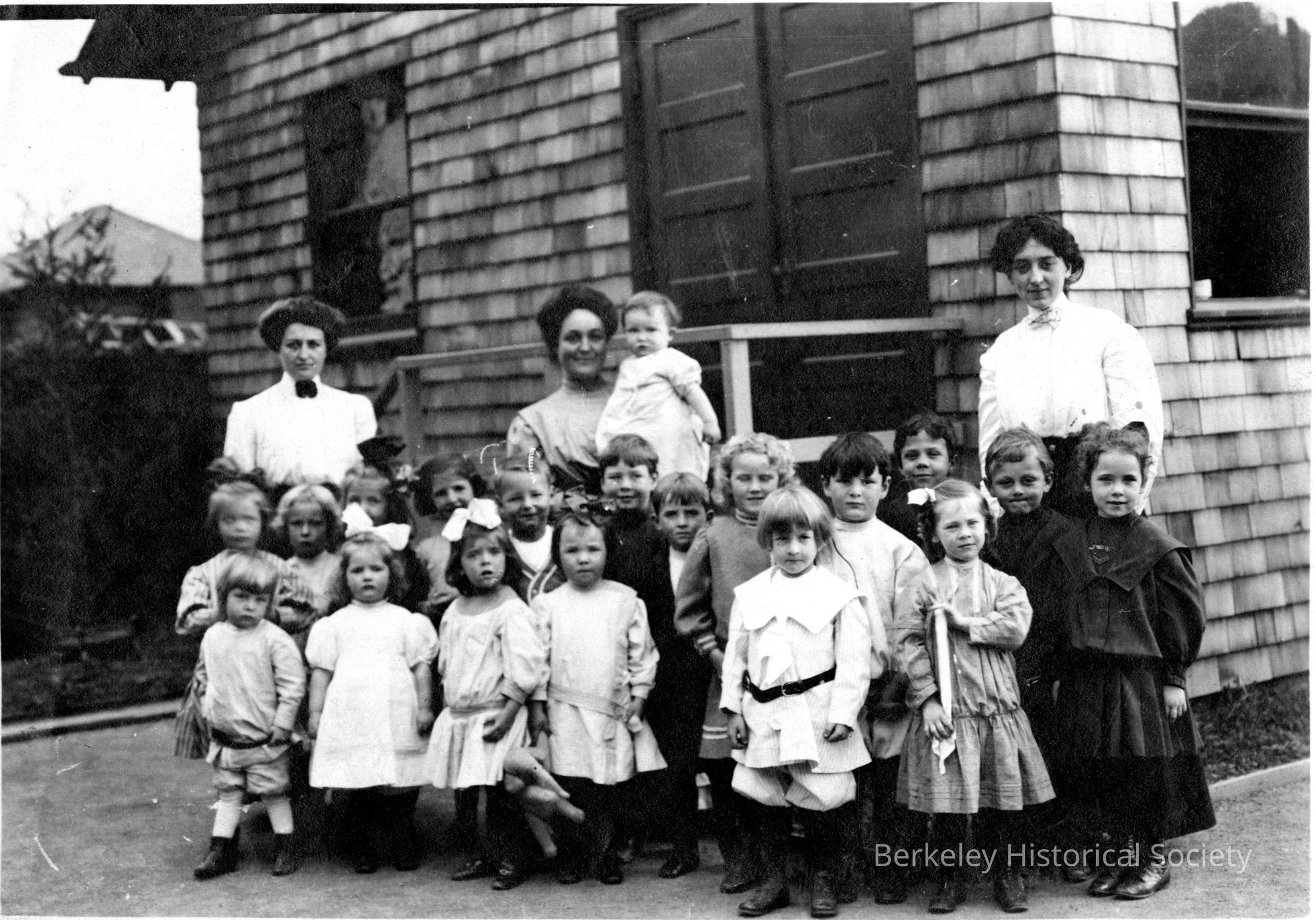 Class and three women in front of shingled building. A private school.Other Names and Numbers