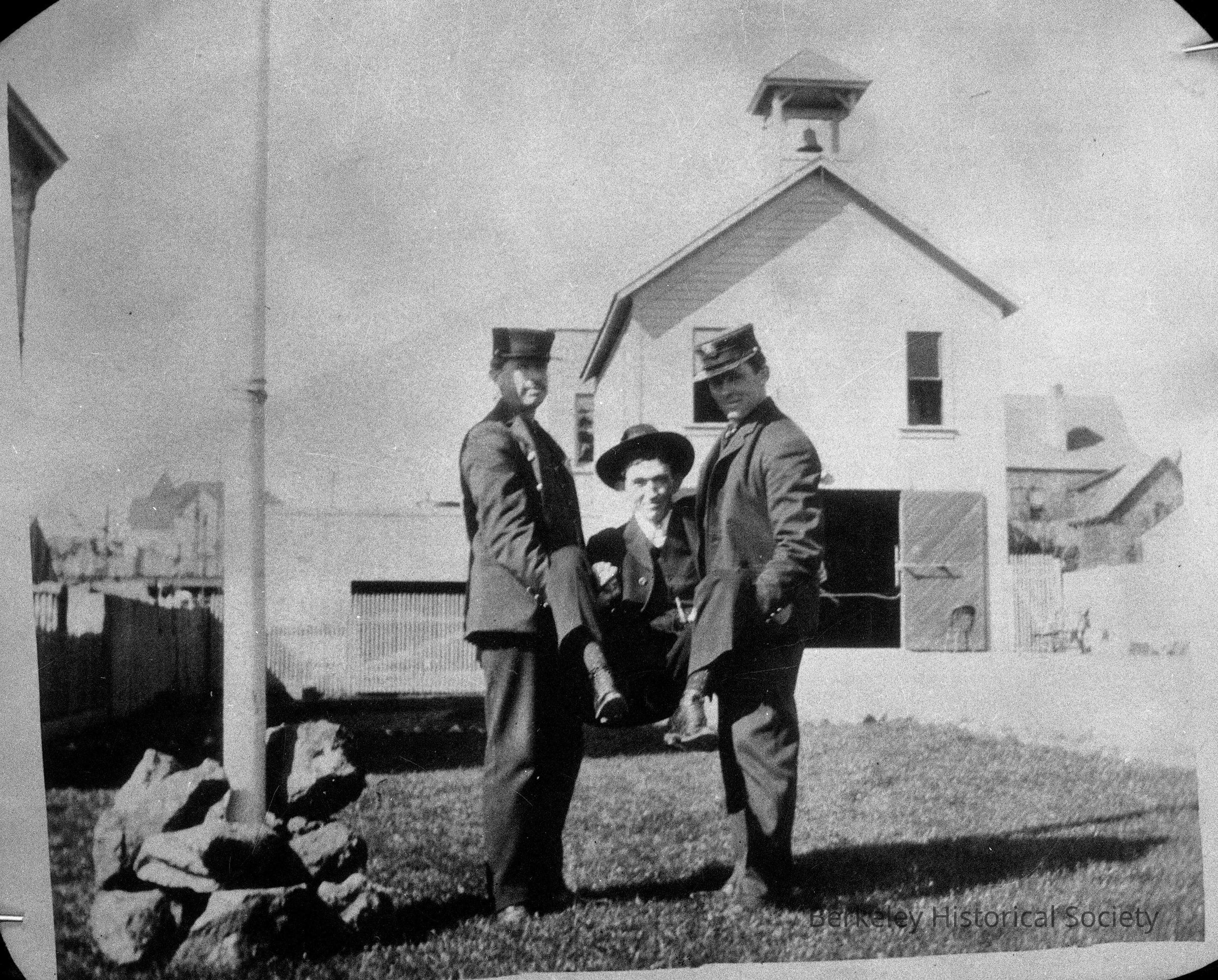 Two young men in uniforms holding a grinning, third young man in a suit. They are positioned beside a flagpole, and in front of a white building with a small tower. This fire station at 2140 Addison, originally called Columbia, was renamed in honor of William H. Marston.Made/Created