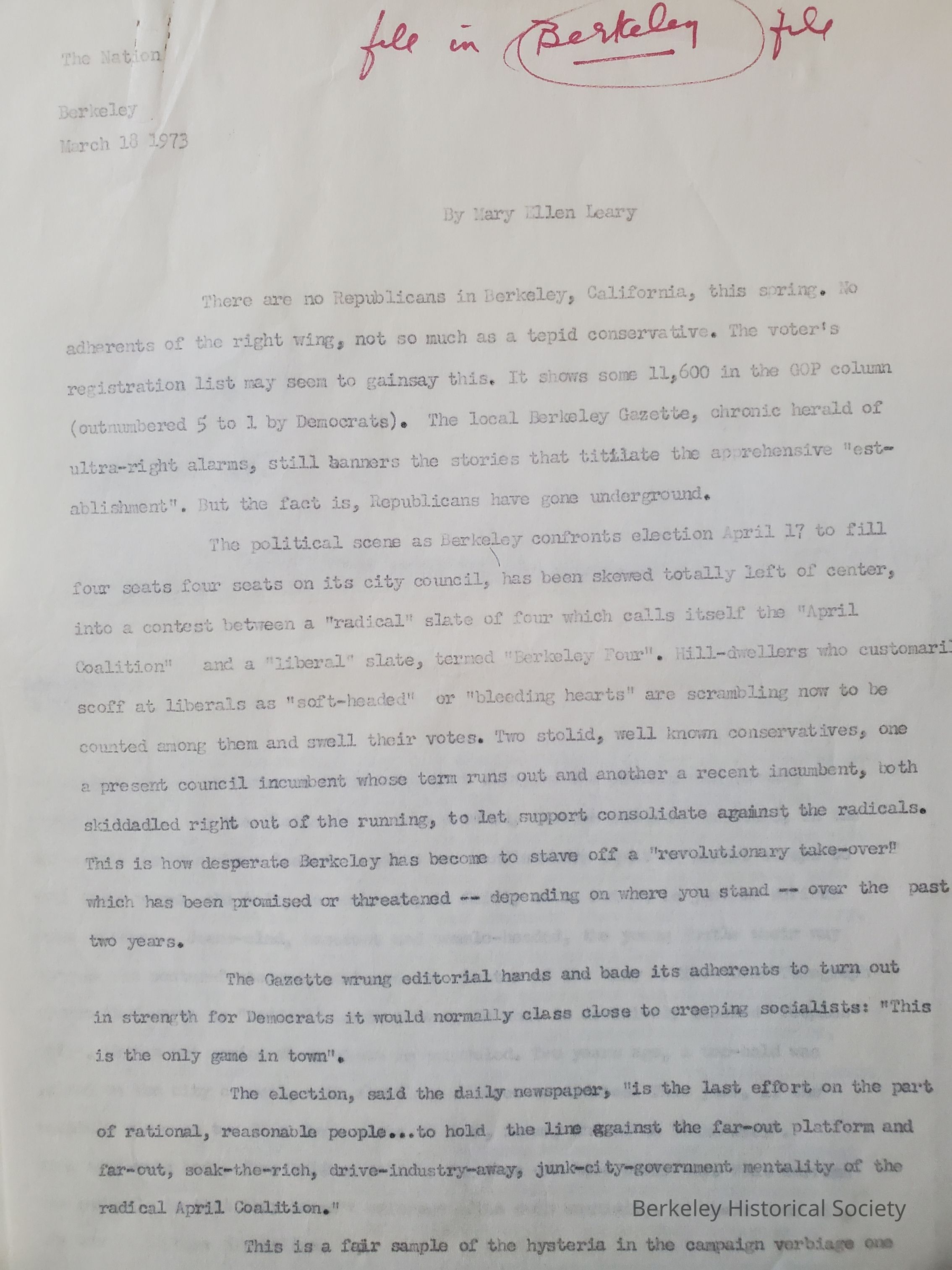 Untitled typescript (carbon) of article on Berkeley politics, written for The Nation, 3/18/1973. The published article appeared in The Nation, 4/9/1973, with the title Confrontation in Berkeley.