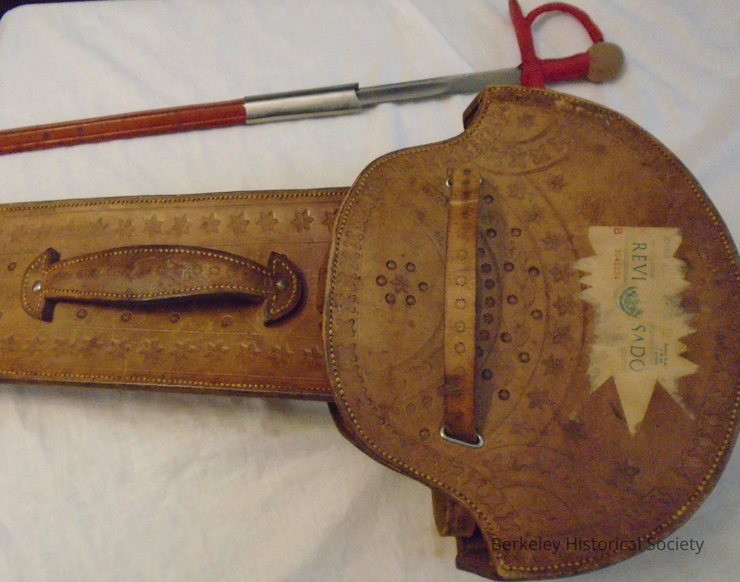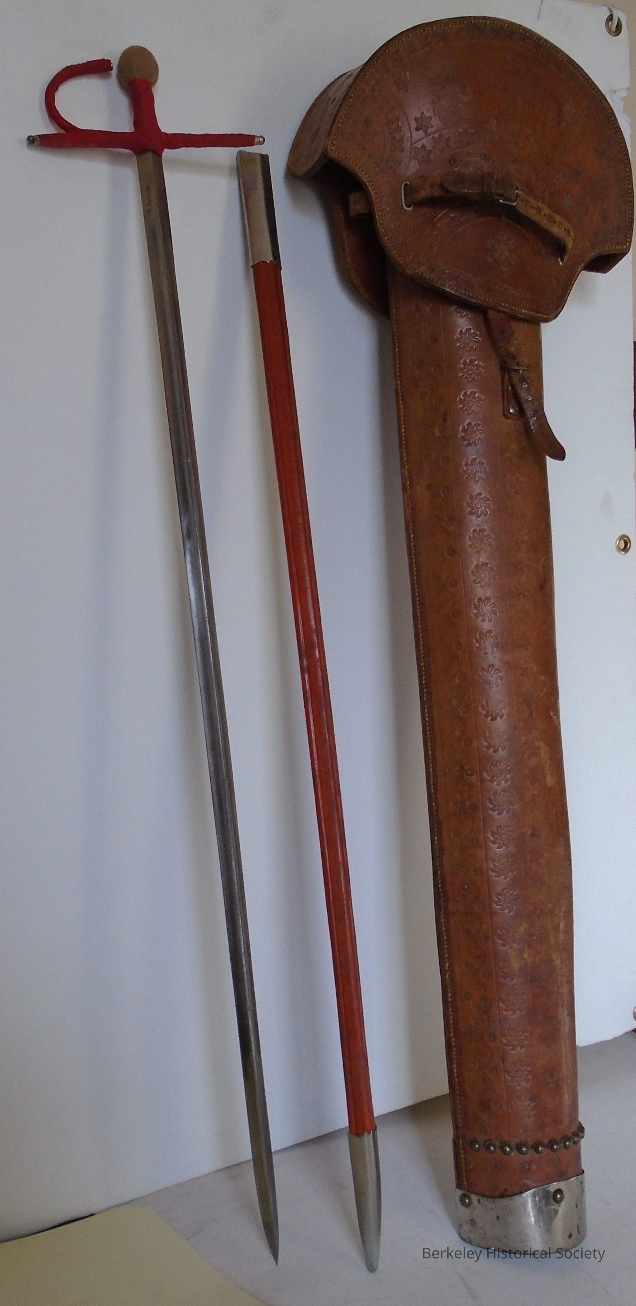 Matador's sword with red leather cover and heavy leather embossed case with buckles and handle for carrying (3 pieces in total). Sword shows imprint of "M. Bermejo", maker of most Spanish swords, located in Toledo, Spain. Sword belonged to Bong Way Wong, resident of Berkeley who became a bullfighter in Spain in the 1960s (named "El Chino"). Case is very heavy and shaped in a semicircle with a metal base. Top slides down over tube and buckles shut. Label on the back is probably a customs label. Sword cover has a metal base and top.Made/Created
