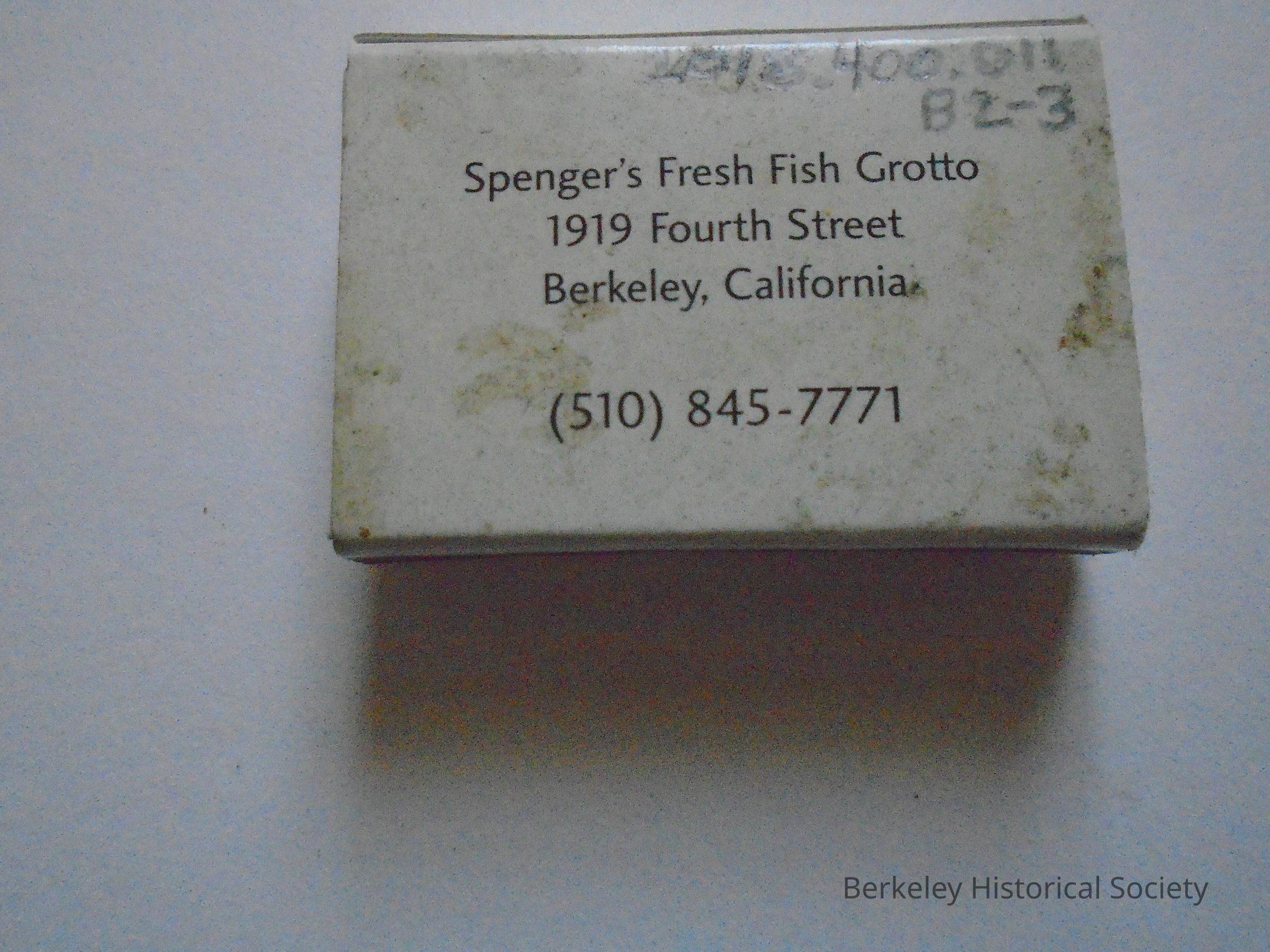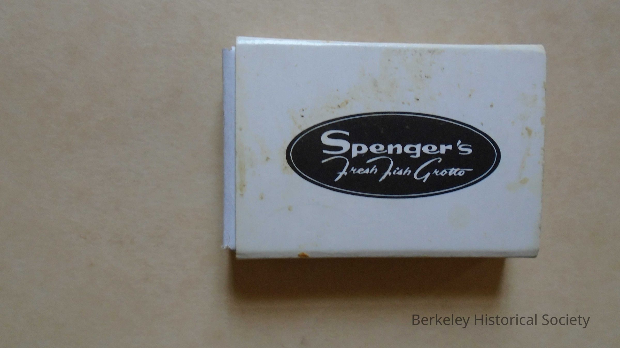 White and black paper cardboard matchbook (matchbox) advertising Spenger's Fresh Fish Grotto. On bottom: 1919 Fourth Street, Berkeley, California (510) 845-7771.