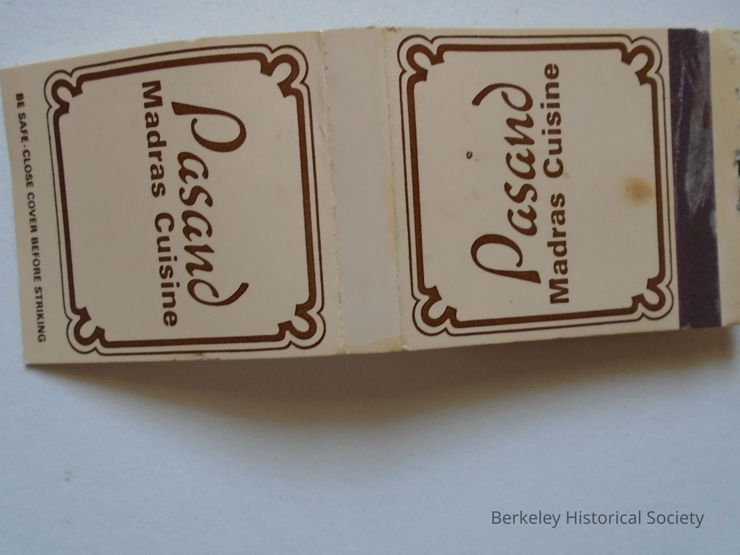 Matchbook with restaurant advertising. Tan paper book with dark brown text: "Pasand Madras Cuisine" and misc information. Inside shows locations, including 2286 Shattuck Ave., Berkeley, Ca