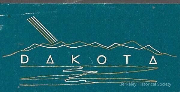 Matchbook with restaurant advertising. Turquoise blue, paper with white text: " DAKOTA GRILL & BAR 2086 Allston Way, Berkeley" Stylized picture of rainbow and mts. in white and yellow with a little red print. Box shape with drawer, no matches.Lexicon