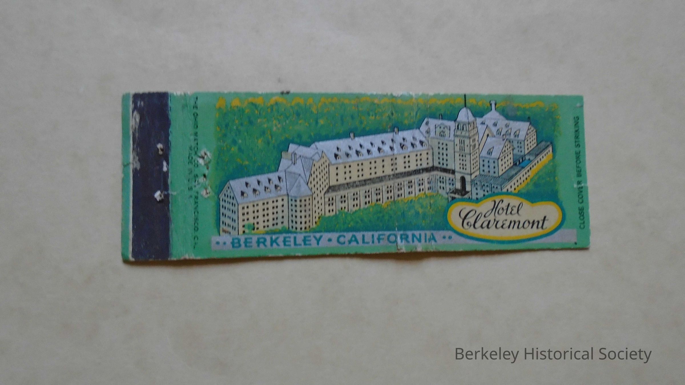 Cardboard matchbook (flattened, no matches) of Hotel Claremont, Berkeley, California. Silver, green, yellow picture of Hotel on front. Back shows rates "from $2.50" and advertisement for Terrace Lounge.Lexicon