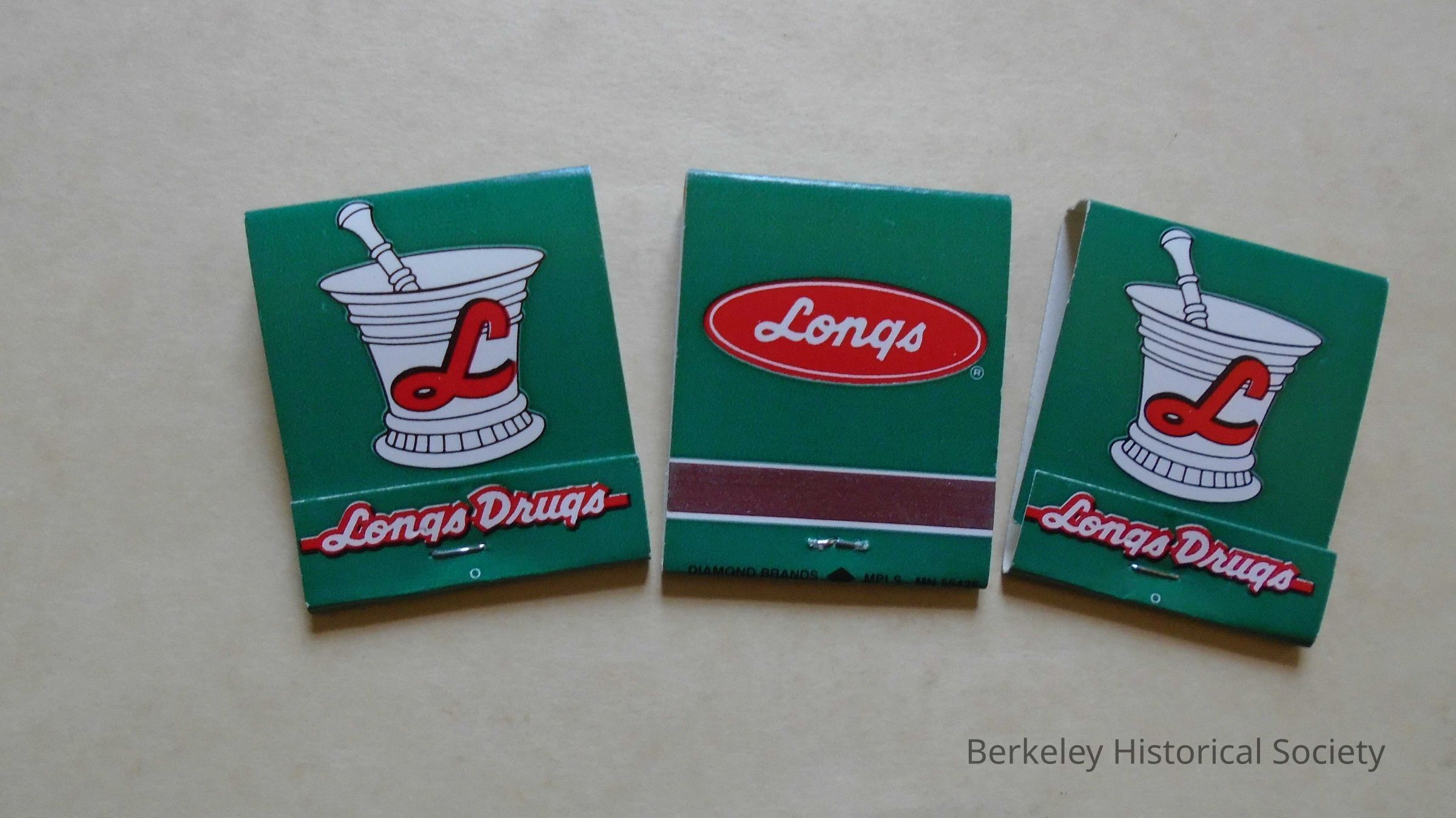 Paper cardboard matchbook in green, red and white, advertising Longs Drugs. Shows mortar and pestle with letter "L" on front. Longs was a drug store chain on the west coast 1938 till 2008, when it was acquired by CVS. Many stores in Berkeley. 3 identical matchbooks.Lexicon