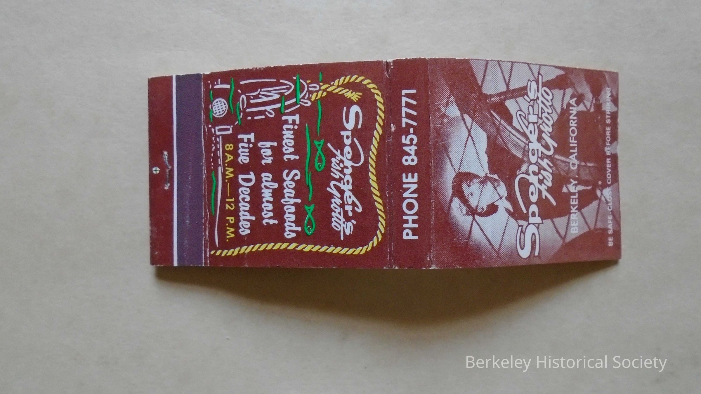 Matchbook with restaurant advertising. Brown, paper with white text: "Spenger's Fish Grotto 1919 Fourth Street, Berkeley California" plus miscellaneous other information. Picture of a mariner at steering at the wheel of a ship on front, Green fish and yellow rope around back side of book.Lexicon