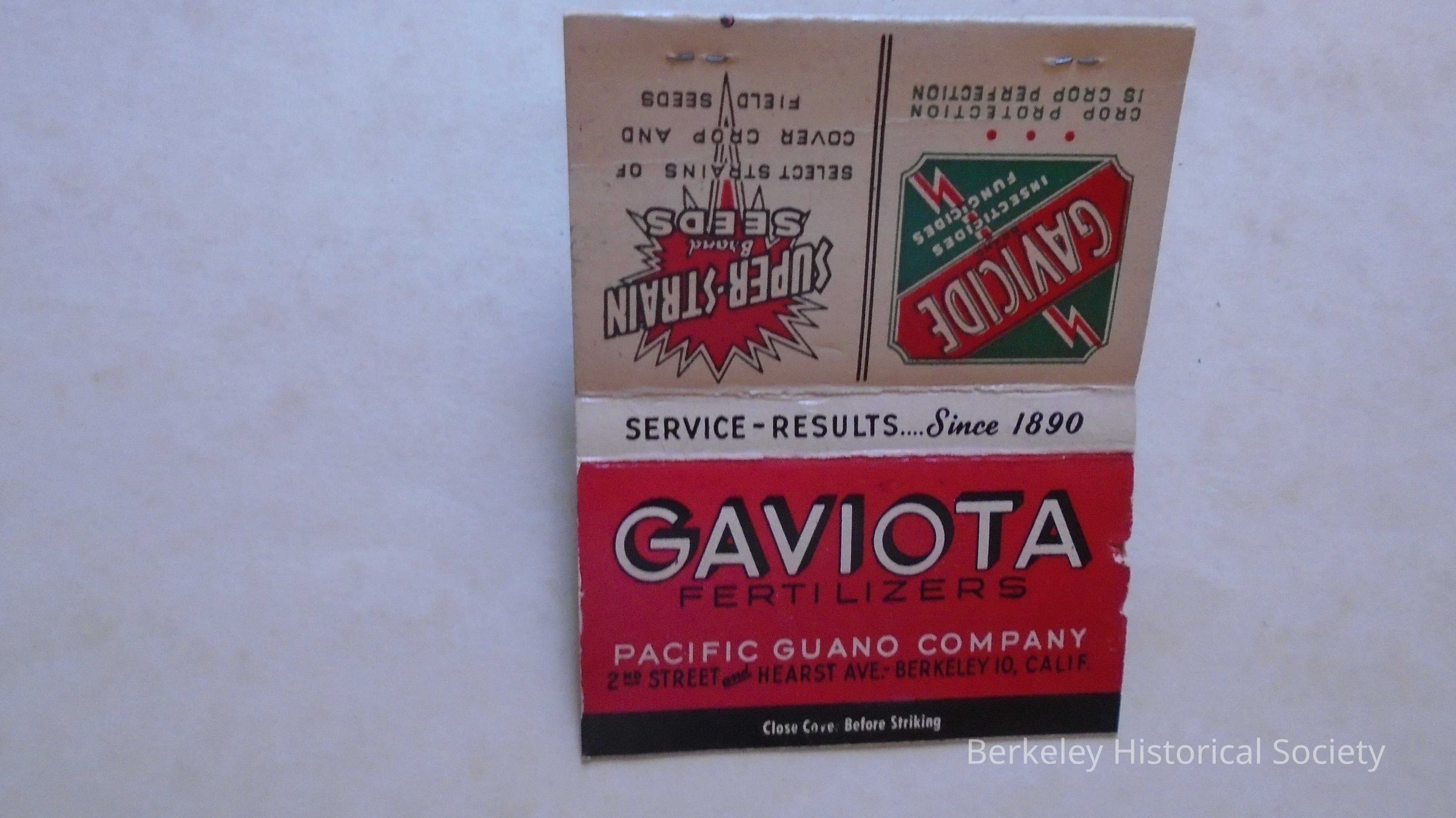 Paper matchbook for Gaviota Fertilizers, Pacific Guano Company, 2nd street and Hearst Ave. Berkeley 10, Calif. Since 1890. On inside cover is a list of warehouses in Calif. and phone # for field representatives. (missing)