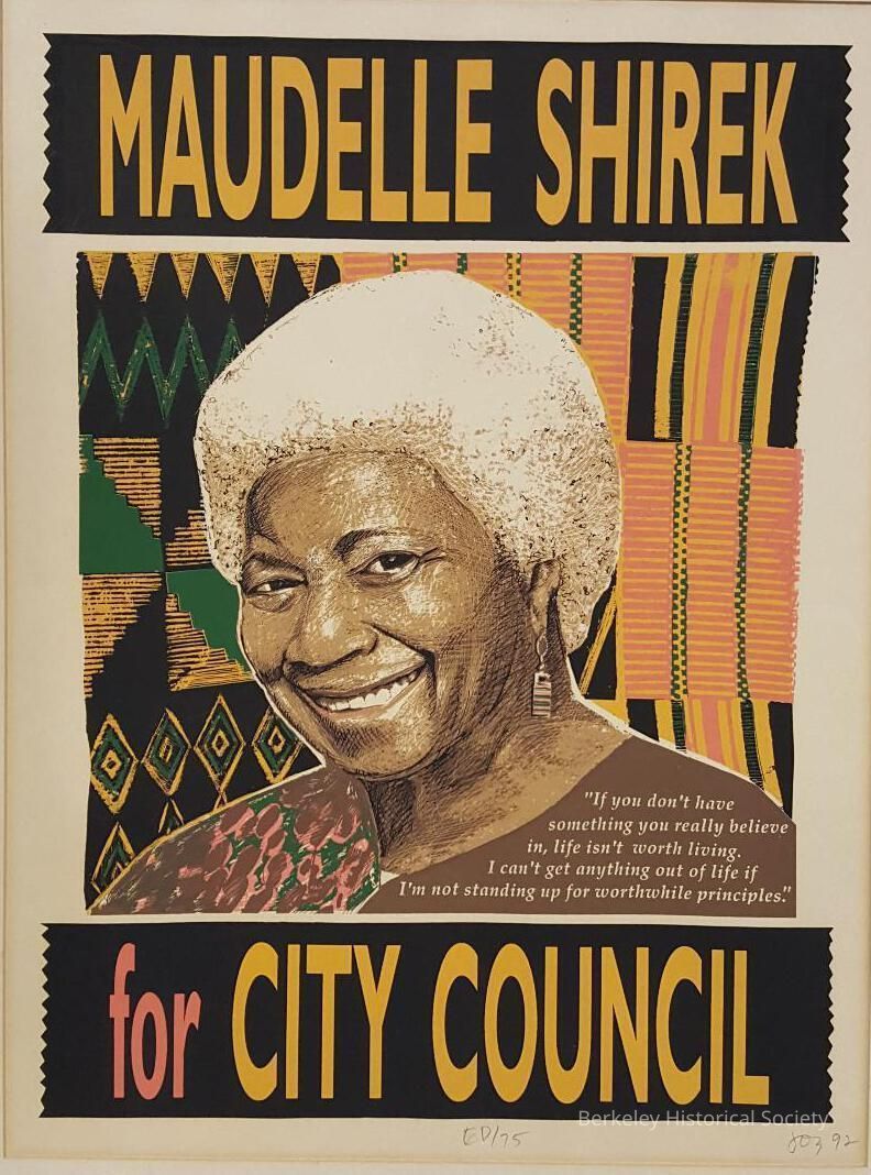 Framed silkscreek print of Maudelle Shirek, running for re-election to Berkeley City Council in1992.