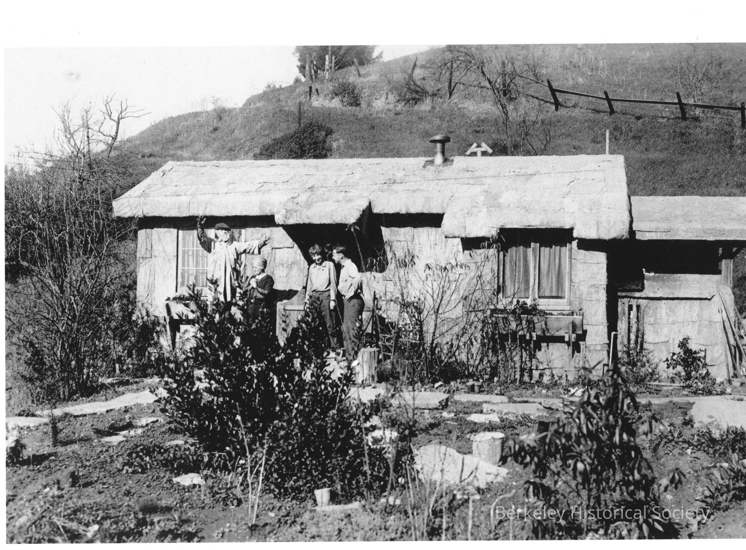 Bernard, Annie, Jacomena and Wallen Maybeck standing in front of building, identified as the Cottage, 1926, in Bernard Maybeck, Visionary Architect (Woodbridge and Barnes).