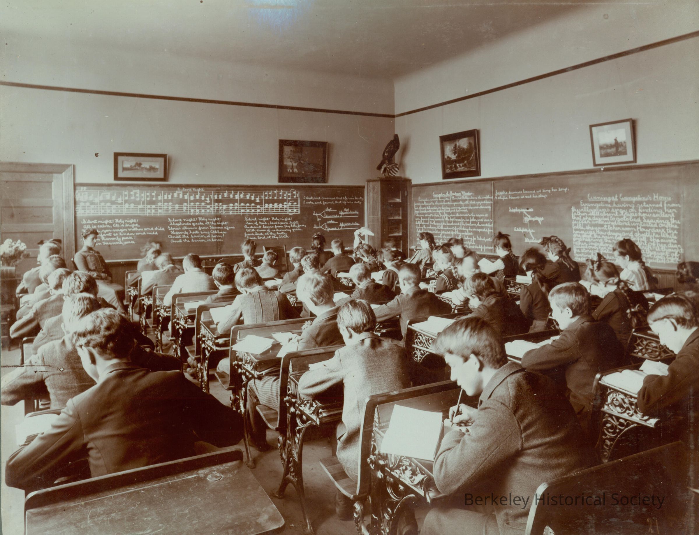 Students at desks with open books; music on blackboard. Teacher seated at front of class