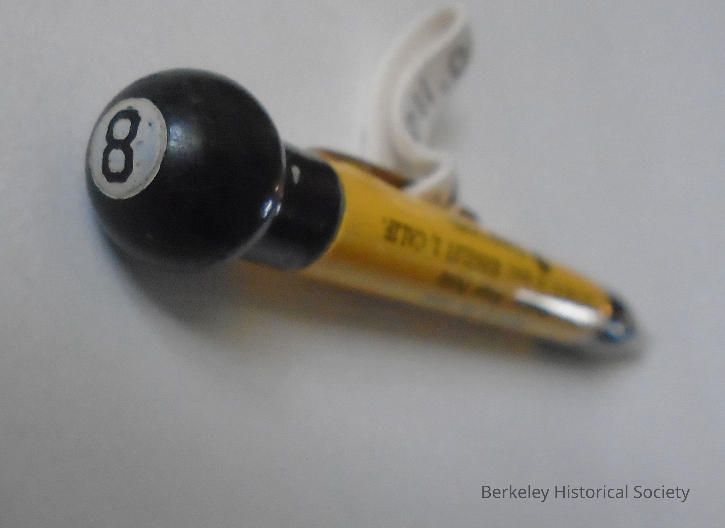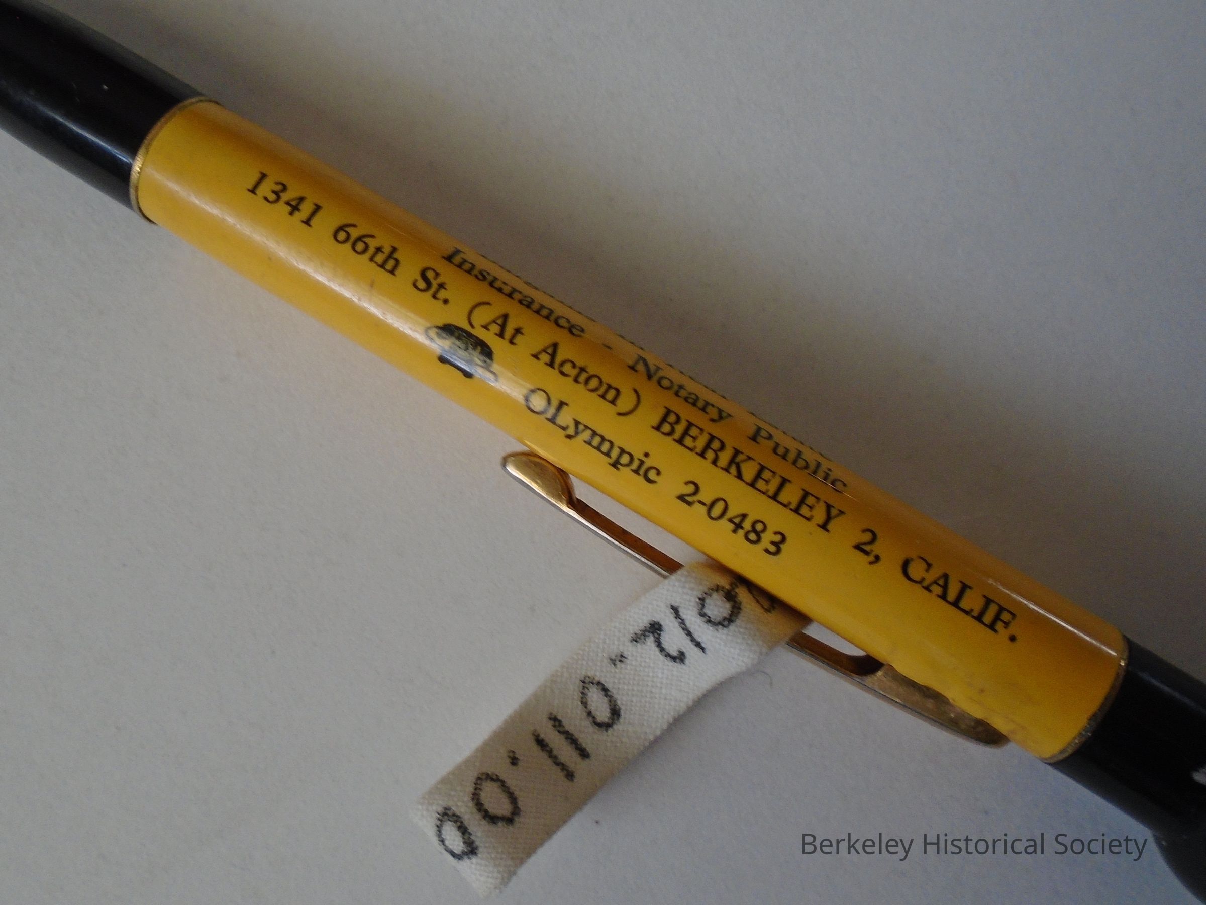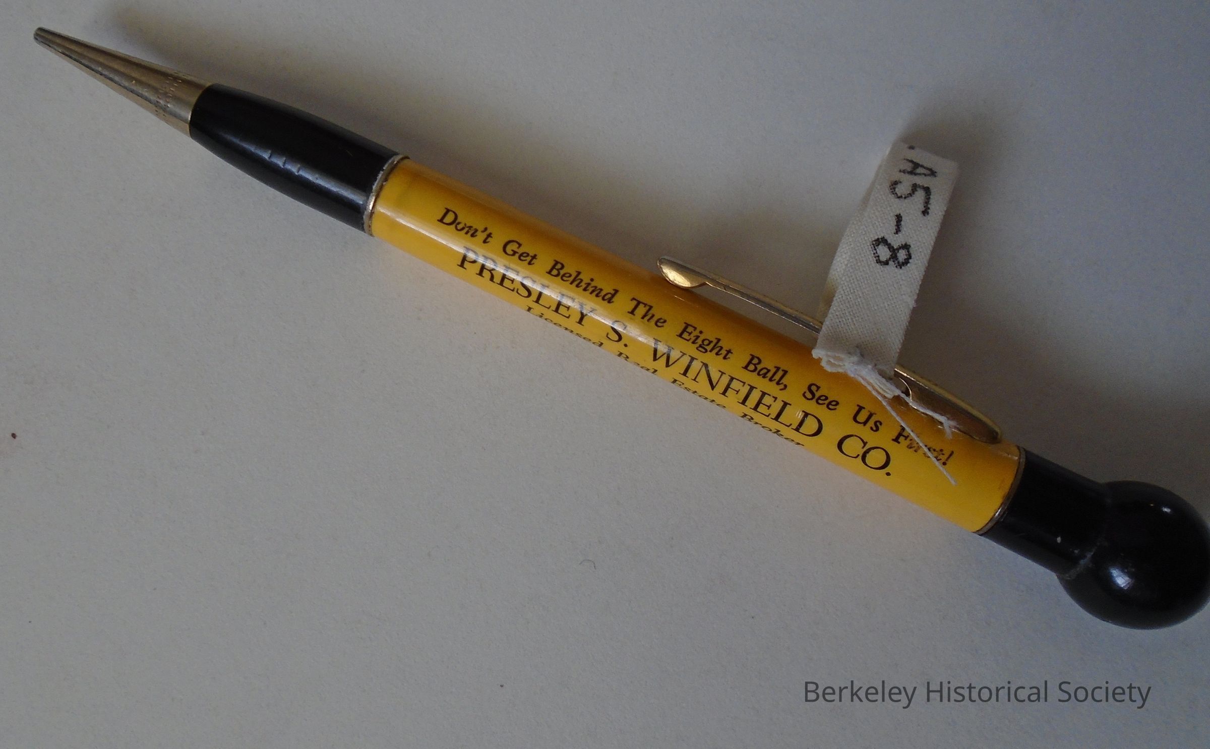 Mechanical pencil, Rodipoint, yellow and black with name of Presley S. Winfield Co., Licensed Real Estate Broker. Bargains in Real Estate, Insurance. 1341 66th (at Acton) Berkeley 2, Calif. OLympic 2-0483. Black knob on end is an "8 Ball".Lexicon