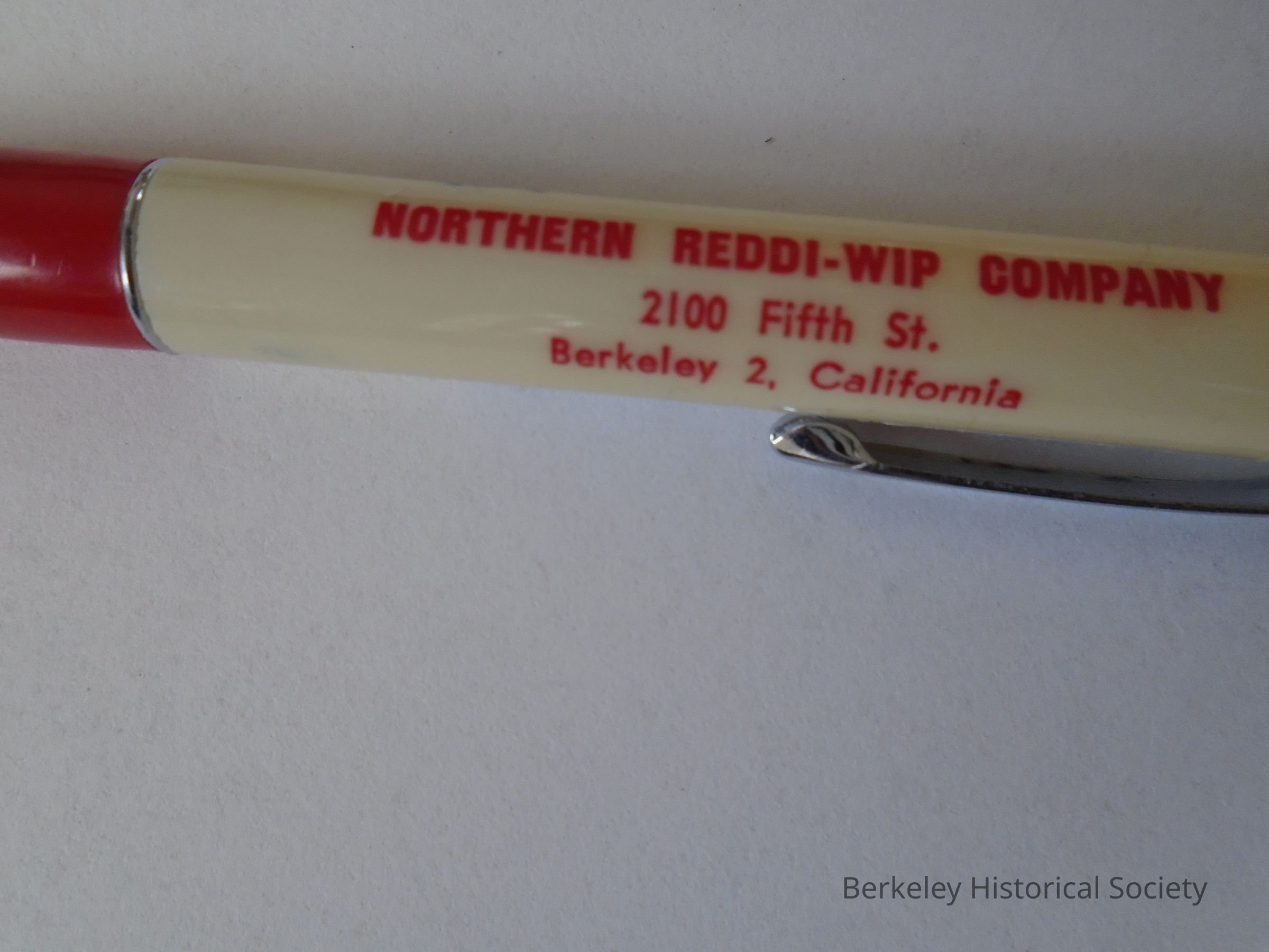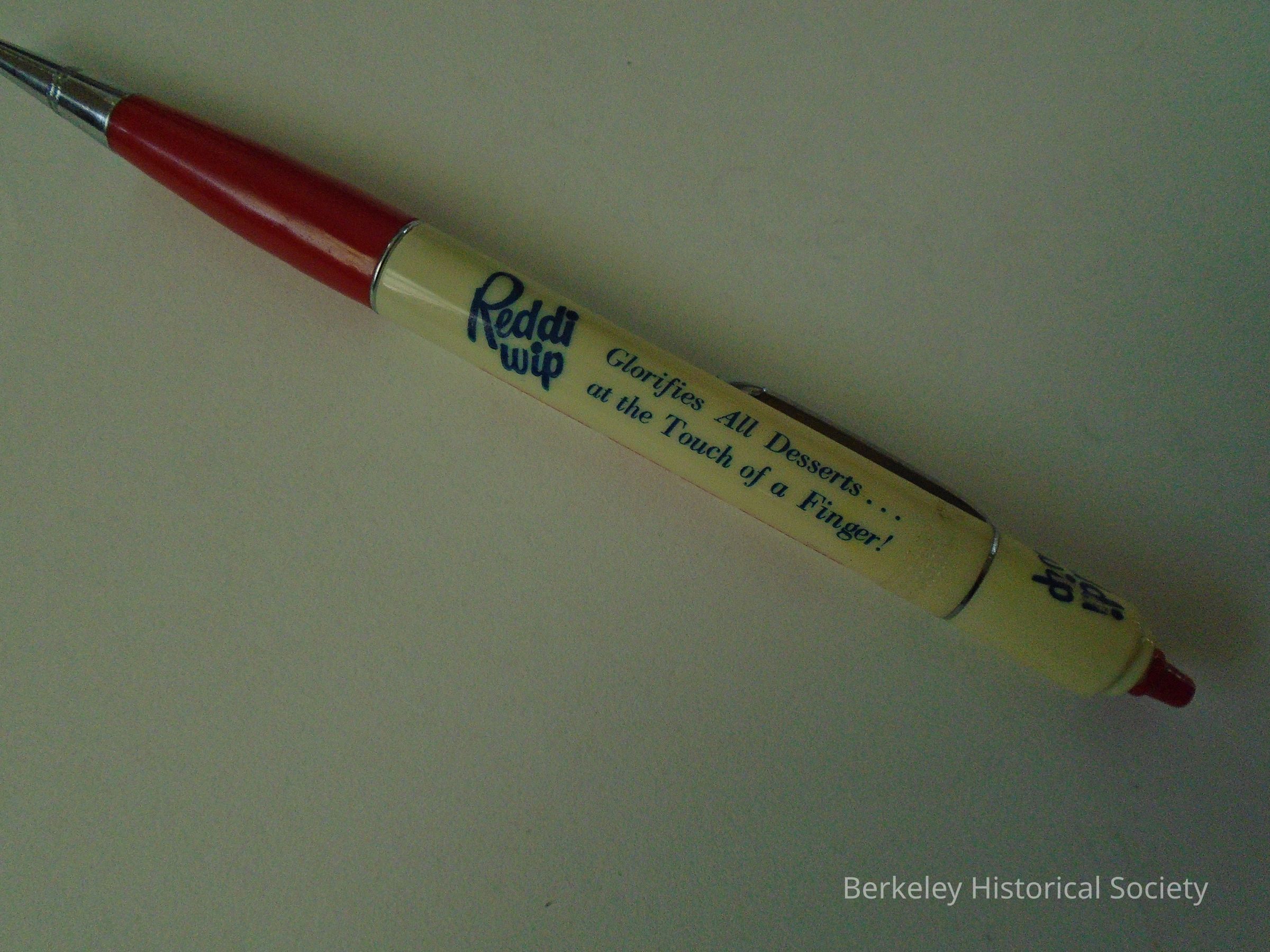 Red and white, plastic and metal Ritepoint mechanical pencil advertising Northern Reddi-Wip Company, 2100 5th St. Berkeley 2, California.