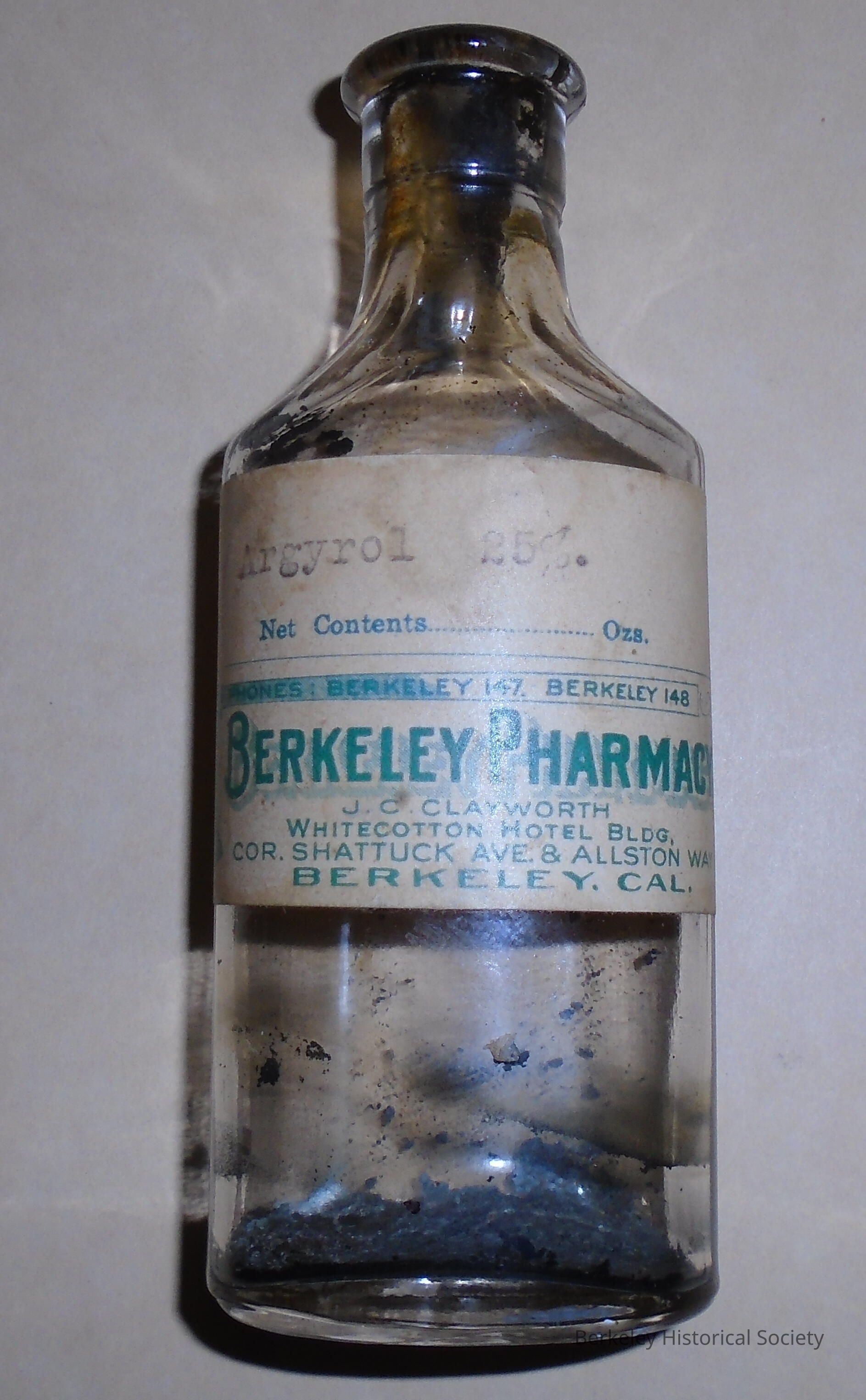 Clear, glass, round shaped bottle for Argyrol 25%. Used by Dr. James E. Shafer (physician & surgeon) in his office at 2162 Center St. Label reads "Berkeley Pharmacy , Whitecotton Hotel Bldg., corner of Shattuck and Allston, Berkeley, Cal. Phone Berkeley 147. Cork is broken. Dr. Shafer lived at 2815 Woolsey St. Berkeley.