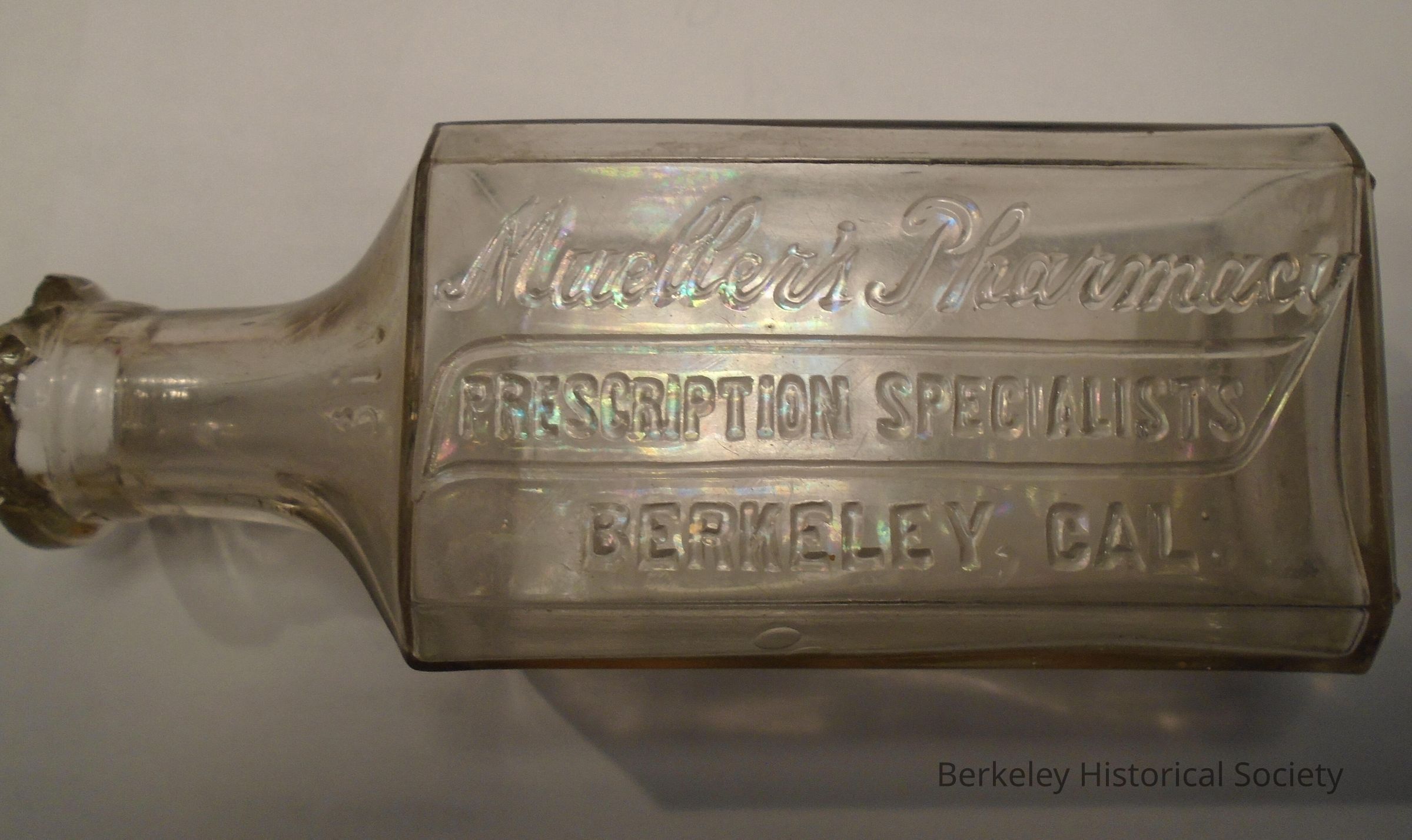 Clear, rectangular, glass bottle from Mueller's Pharmacy, prescription specialists, Berkeley, CAL.