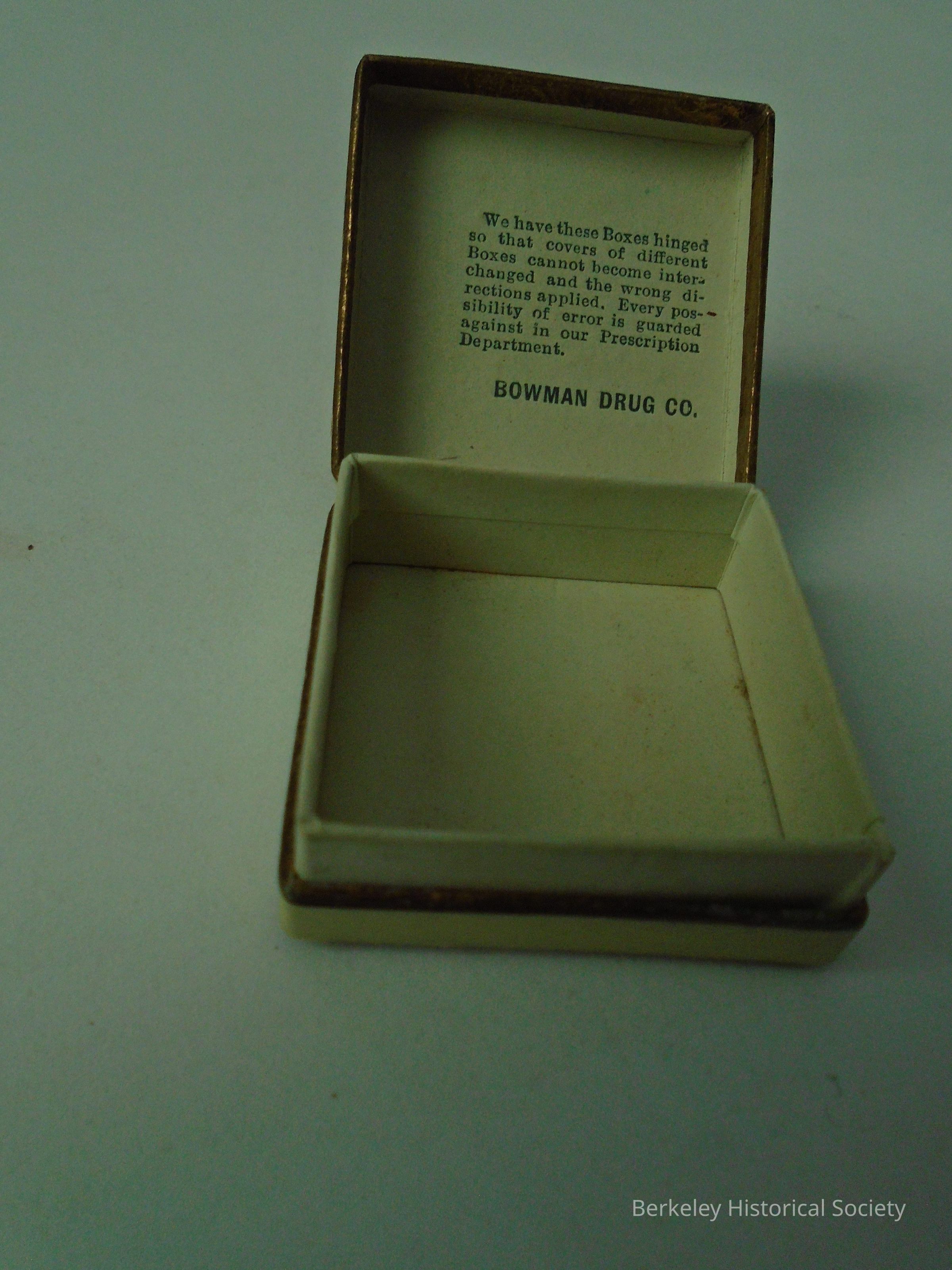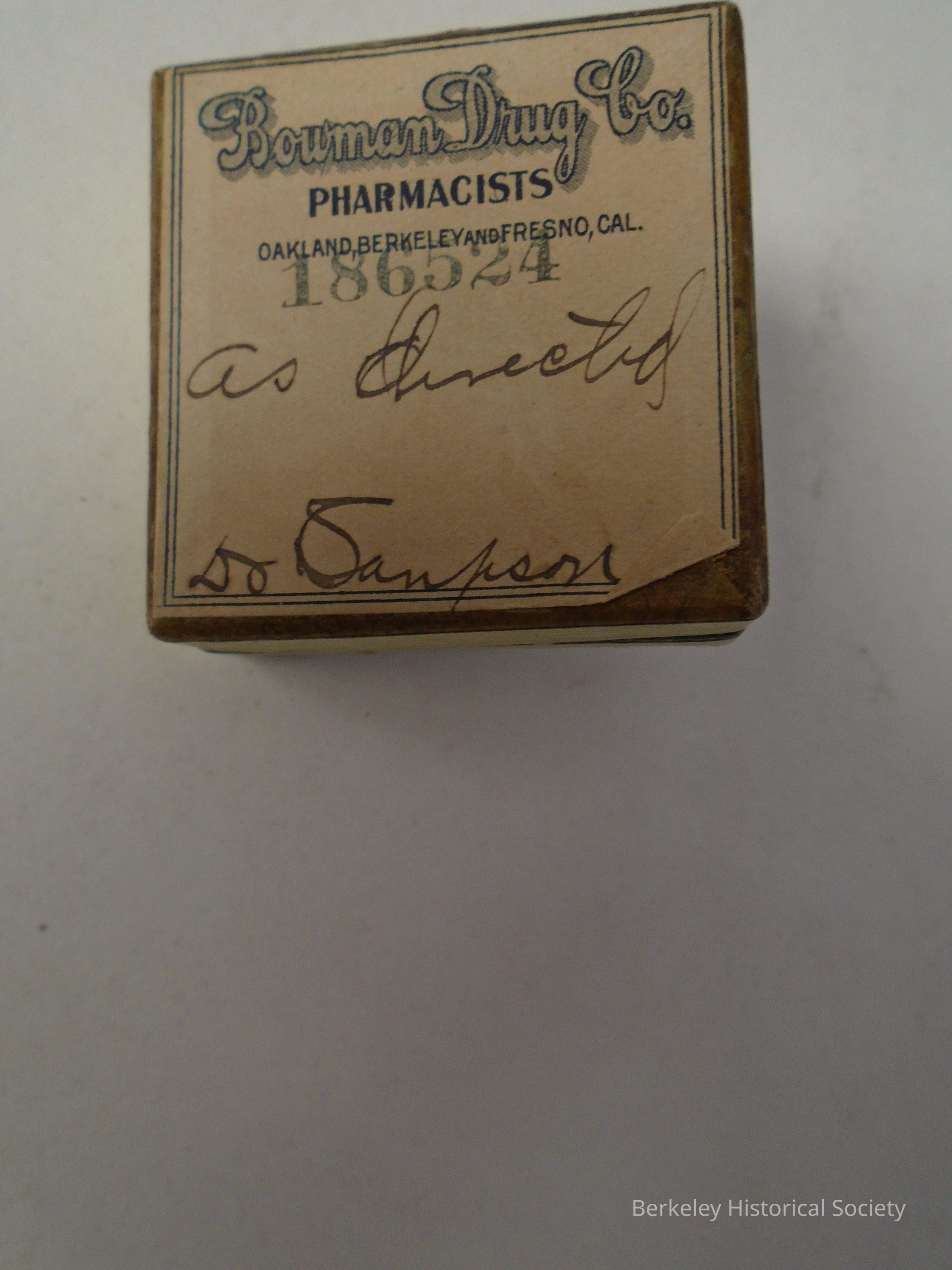 Small, square medicine box from Bowman Drug Co. Pharmacists (Oakland, Berkeley and Fresno, CAL.). Stamped on label: 186524. Handwriting: "as directed Dr. Sampson."Made/Created