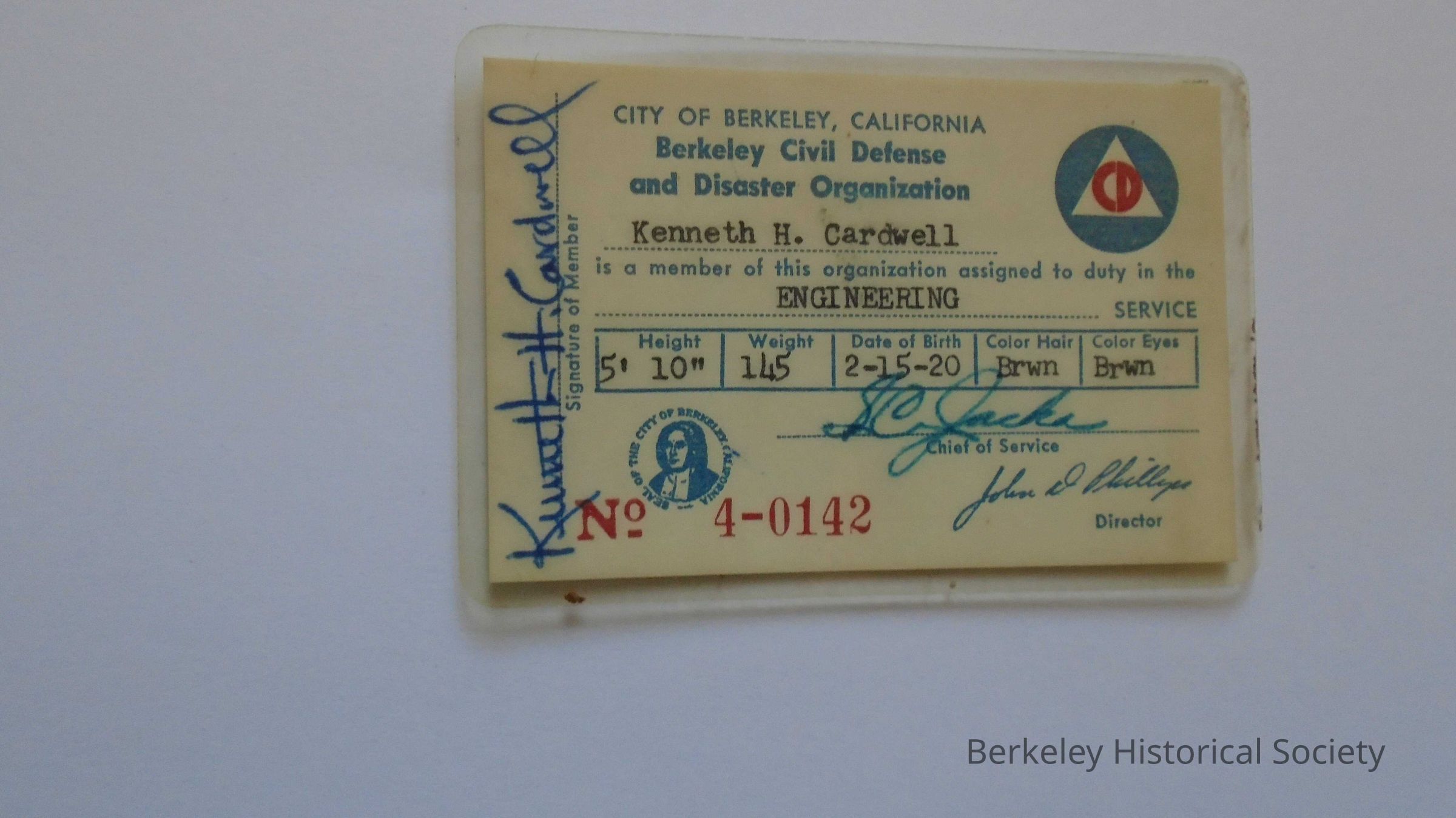 Berkeley Civil Defense and Disaster Organization card belonging to Kenneth H. Cardwell. Card has his physical description and signature and shows he is assigned to duty in the Engineering Service. Card is paper encased in plastic and has the number 4-0142.