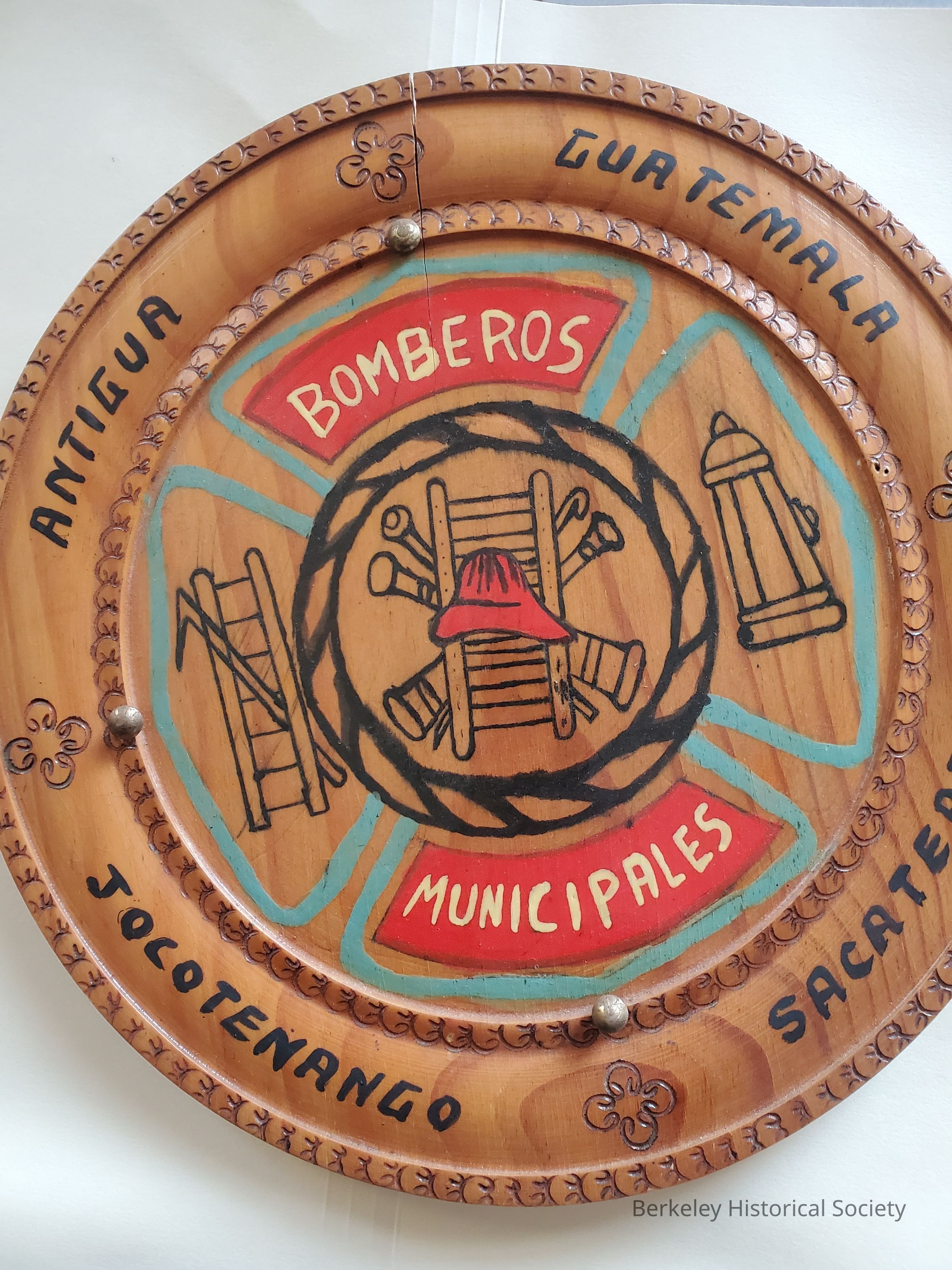Painted wooden plate, firemen theme, also Guatemala (Box 1)