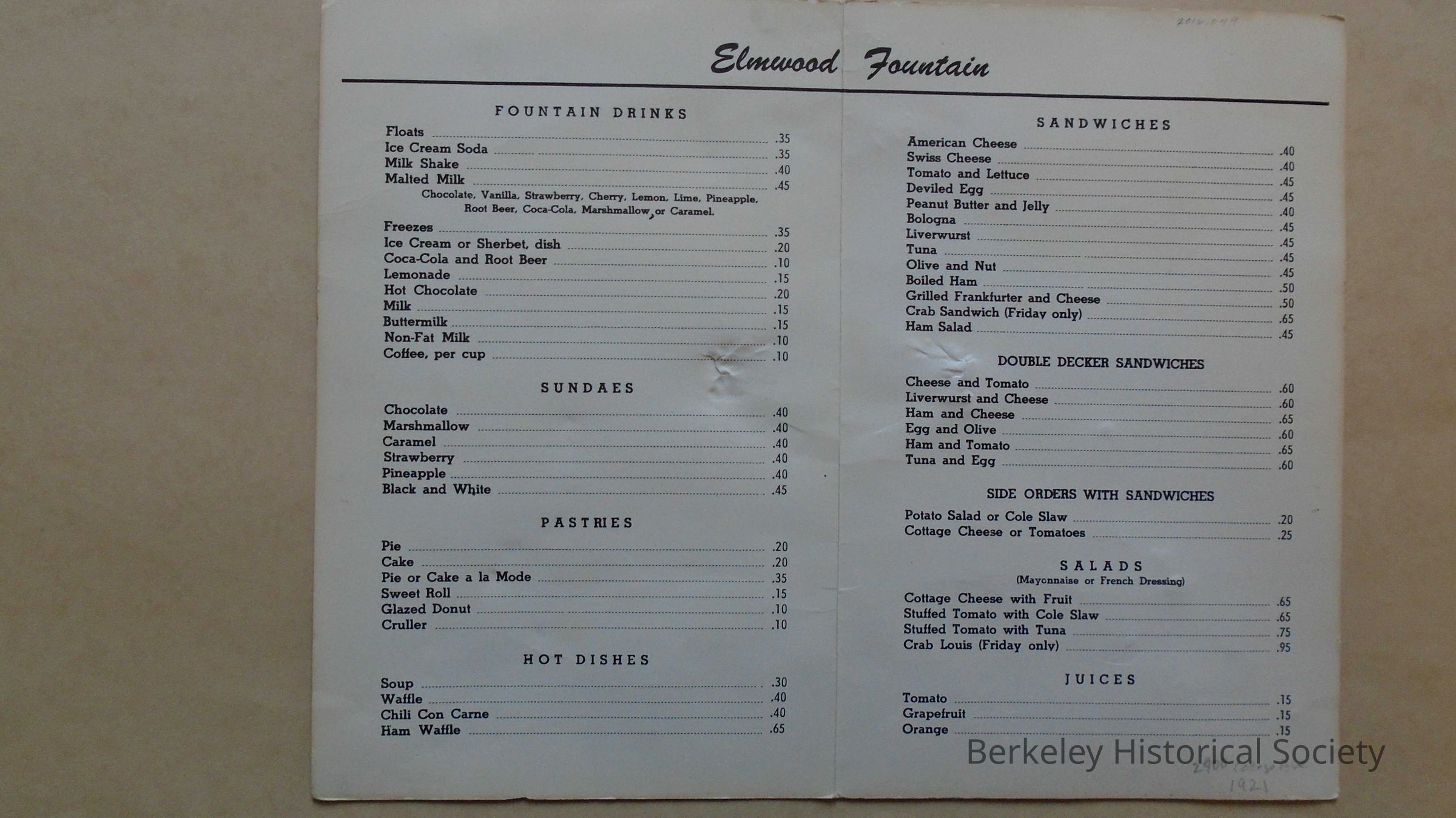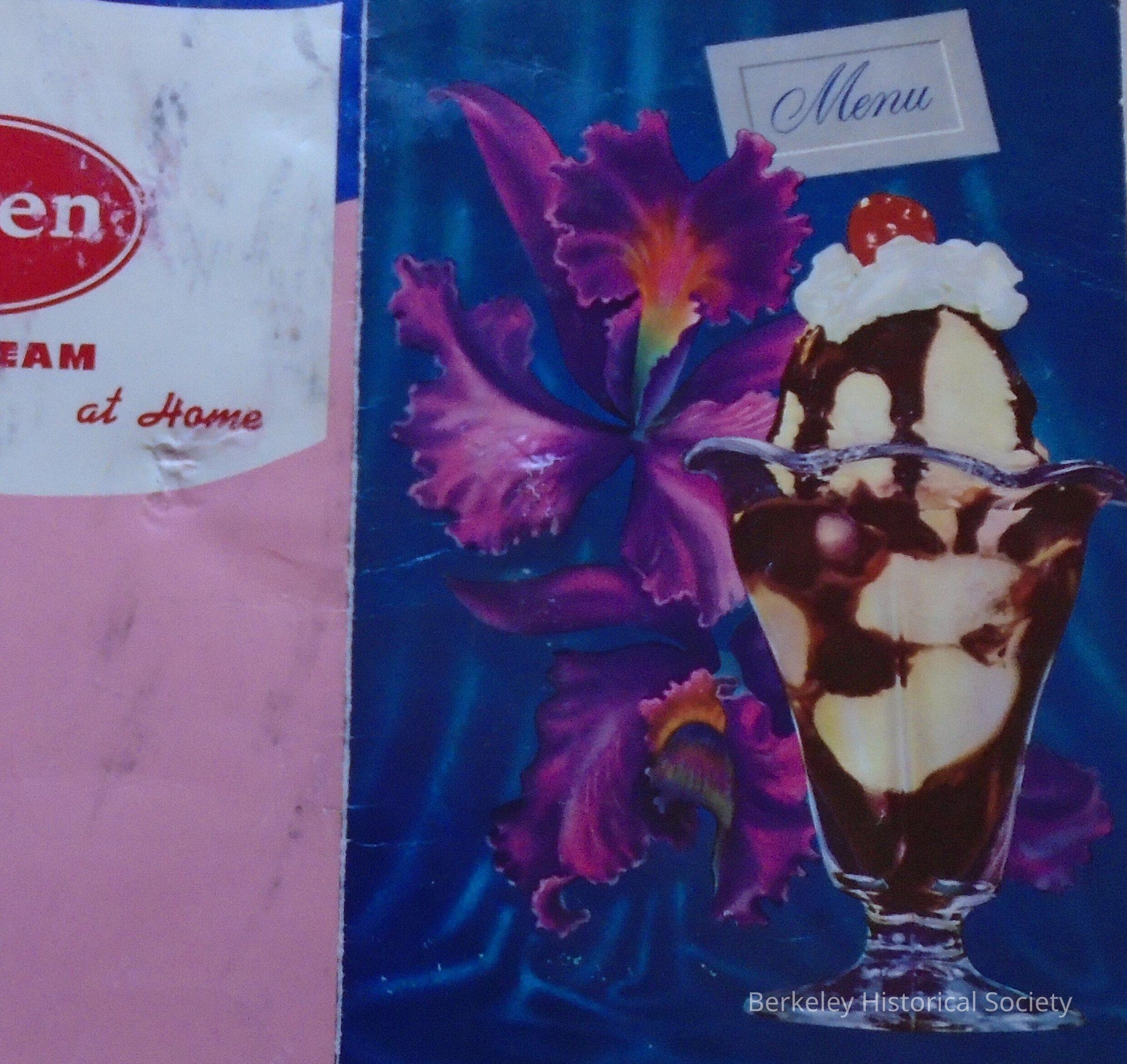 Paper menu for Elmwood Fountain. Located in Elmwood Pharmacy, 2900 College Ave. Owner Fred Beretta, 1921. Picture of orchids and chocolate sundae on front. Bought by Charles "Ozzie" Osborne in 1951 and renamed.