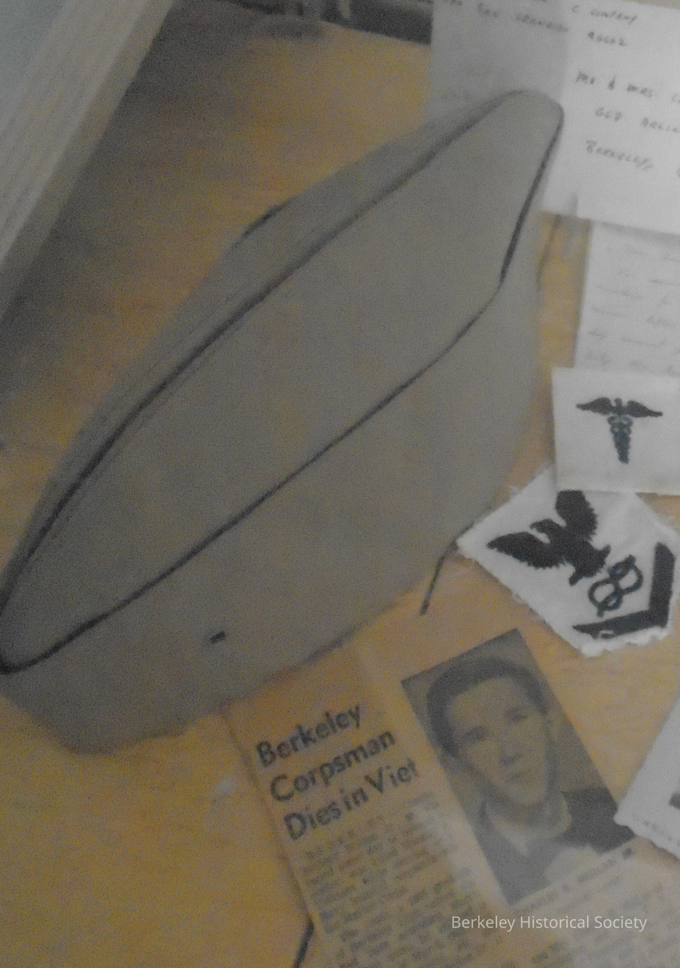 Cotton, tan, soft/folding military cap belonging to hospital corpsman Charles Richard Mullan, Jr. (Navy-HN-E3, 1st Battalion, 9th Marines..."Doc"). Born 12/16/46, died in Vietnam 6/28/67. See also Vietnam Veterans archives box 2015.051.