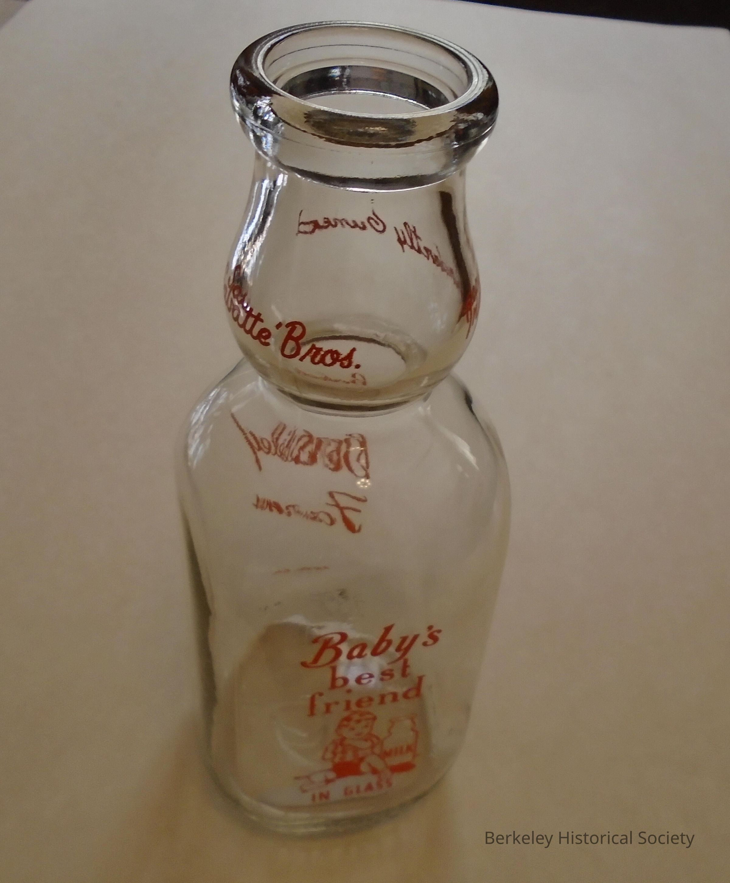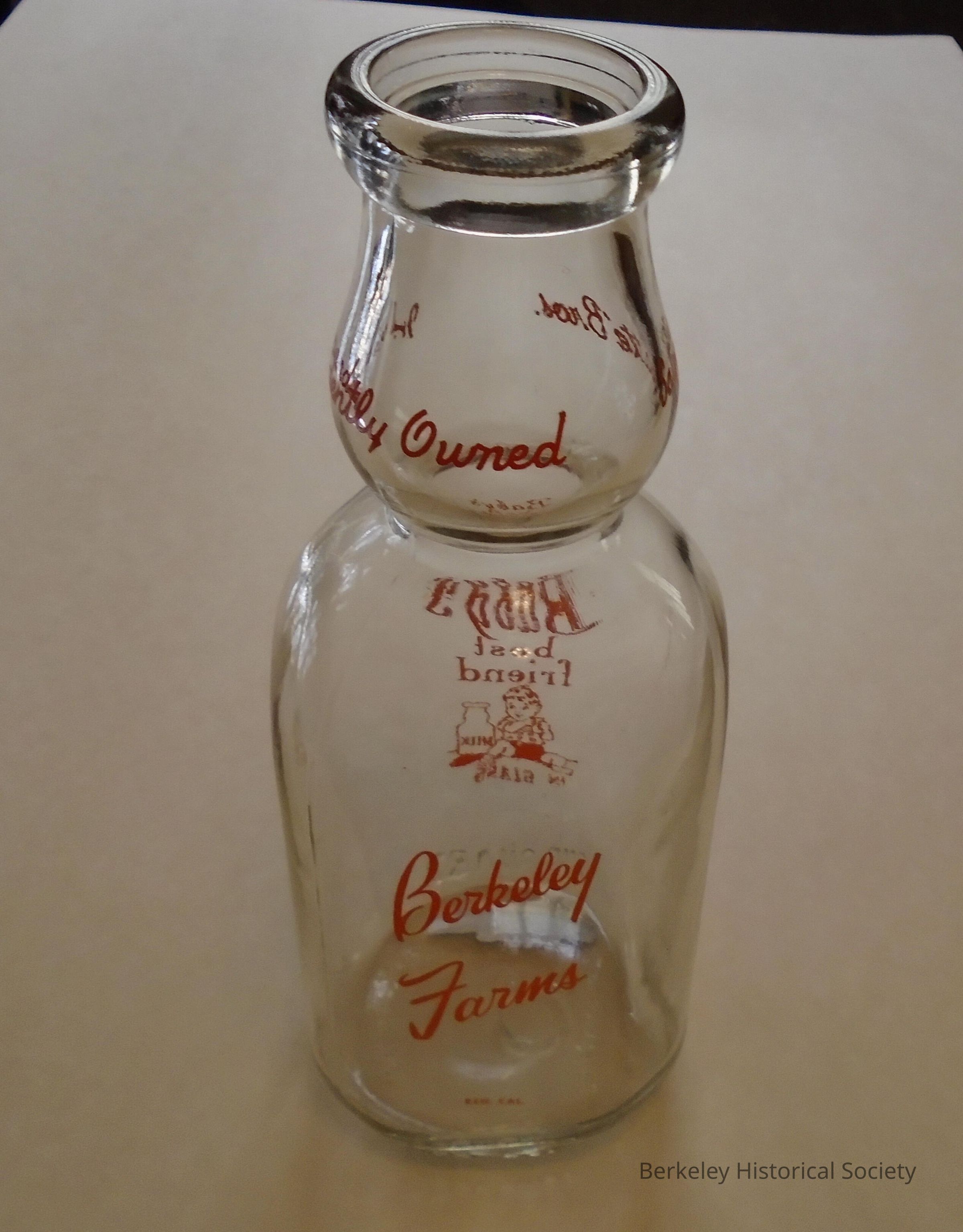 Glass, one quart milk bottle. Red lettering: "Berkeley Farms". On back side: "Baby's best friend, milk in a glass and a picture of a baby. " On top where cream separated, text reads: "Sabatte Bros., independently owned. Body of bottle is squarish, while top and bottom is round.