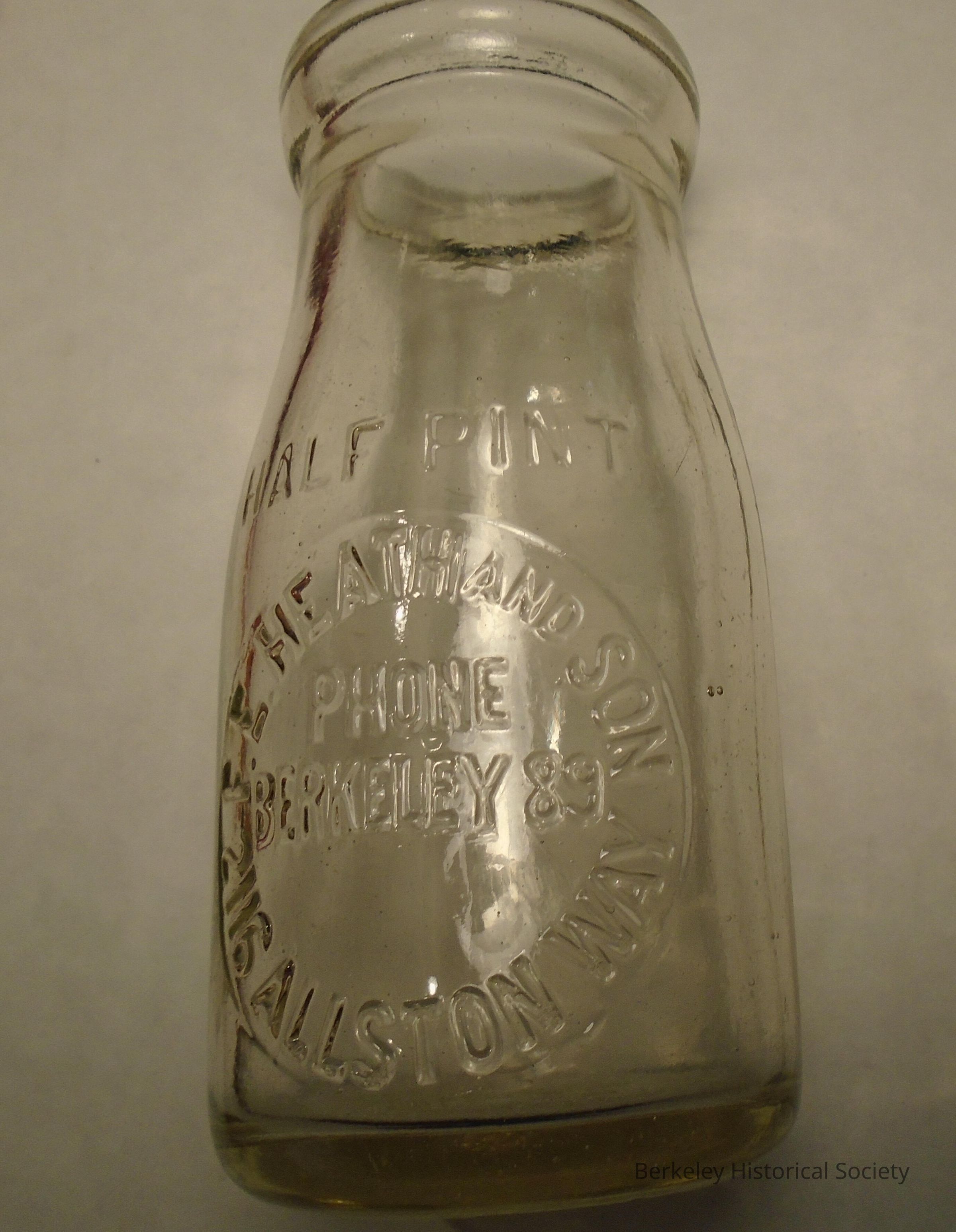 Glass half pint milk bottle (could be cream bottle). Embossed in glass: "F.E. Heath and Son 2116 Allston Way Phone Berkeley 89" in a circle. Frank E. Heath is listed as the proprietor of Berkeley Farms Creamery at 2717 Haste. Found under a house at 1028 Merced St. (built in 1917) in Berkeley. See also 1978.002.142
