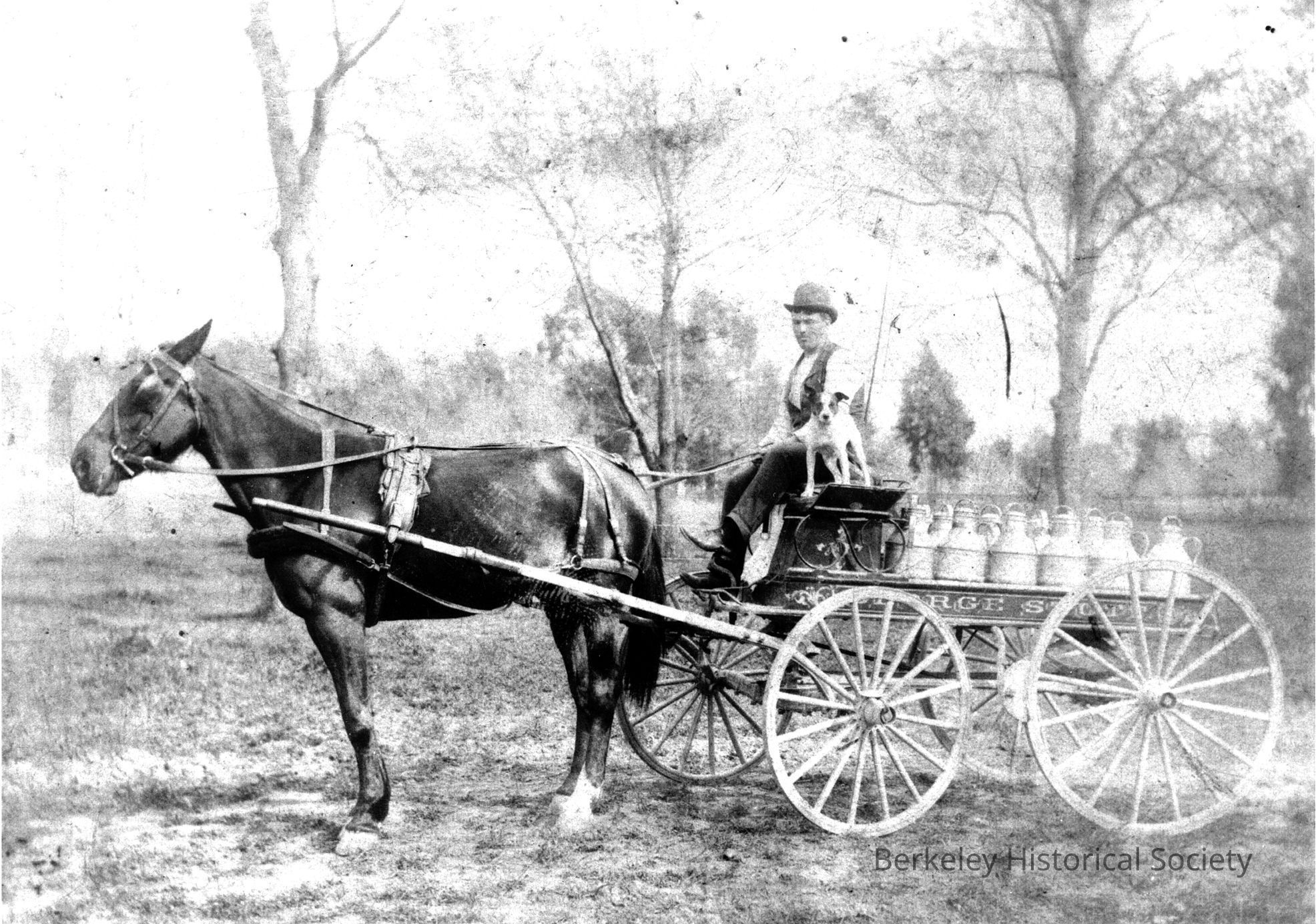 Man with dog on seat of horse drawn wagon; milk cans loaded on wagon. Name on side of wagon partially visible, possibly George Stott. Unidentified locationOther Names and Numbers
