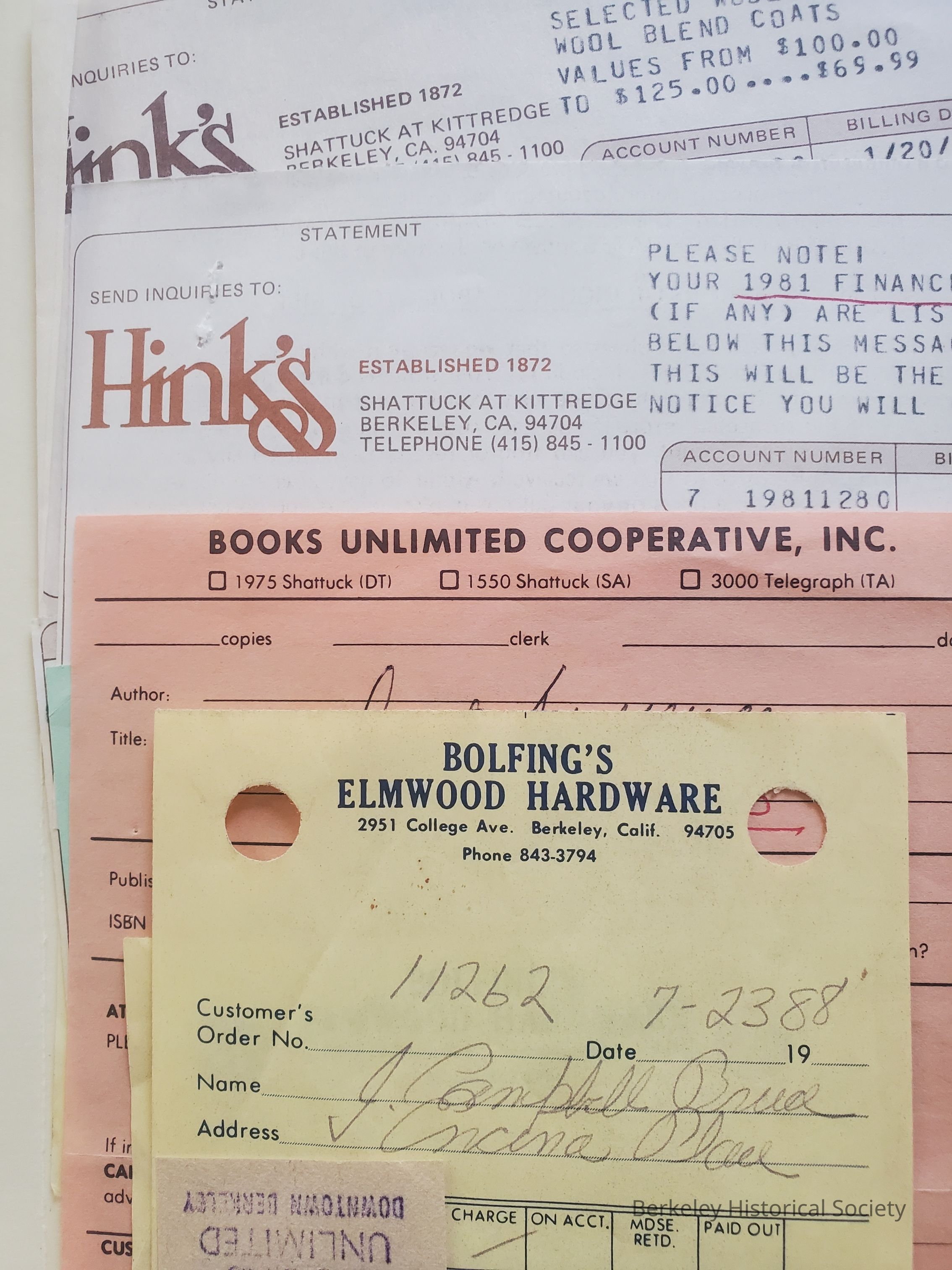 Contains receipts for purchases from Bolfings Elmwood Hardward, Hink's, Berkeley Daily Gazette, Books Unlimited Cooperative, and East Bay Nursery.Lexicon