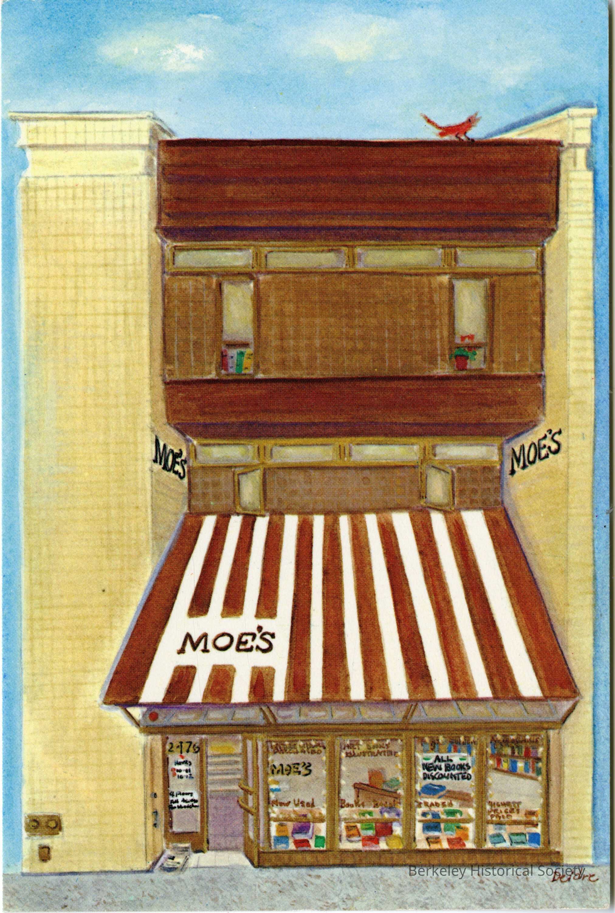Two divided postcards featuring picture of a color painting of Moe's Books (2476 Telegraph Avenue) by Deidre.