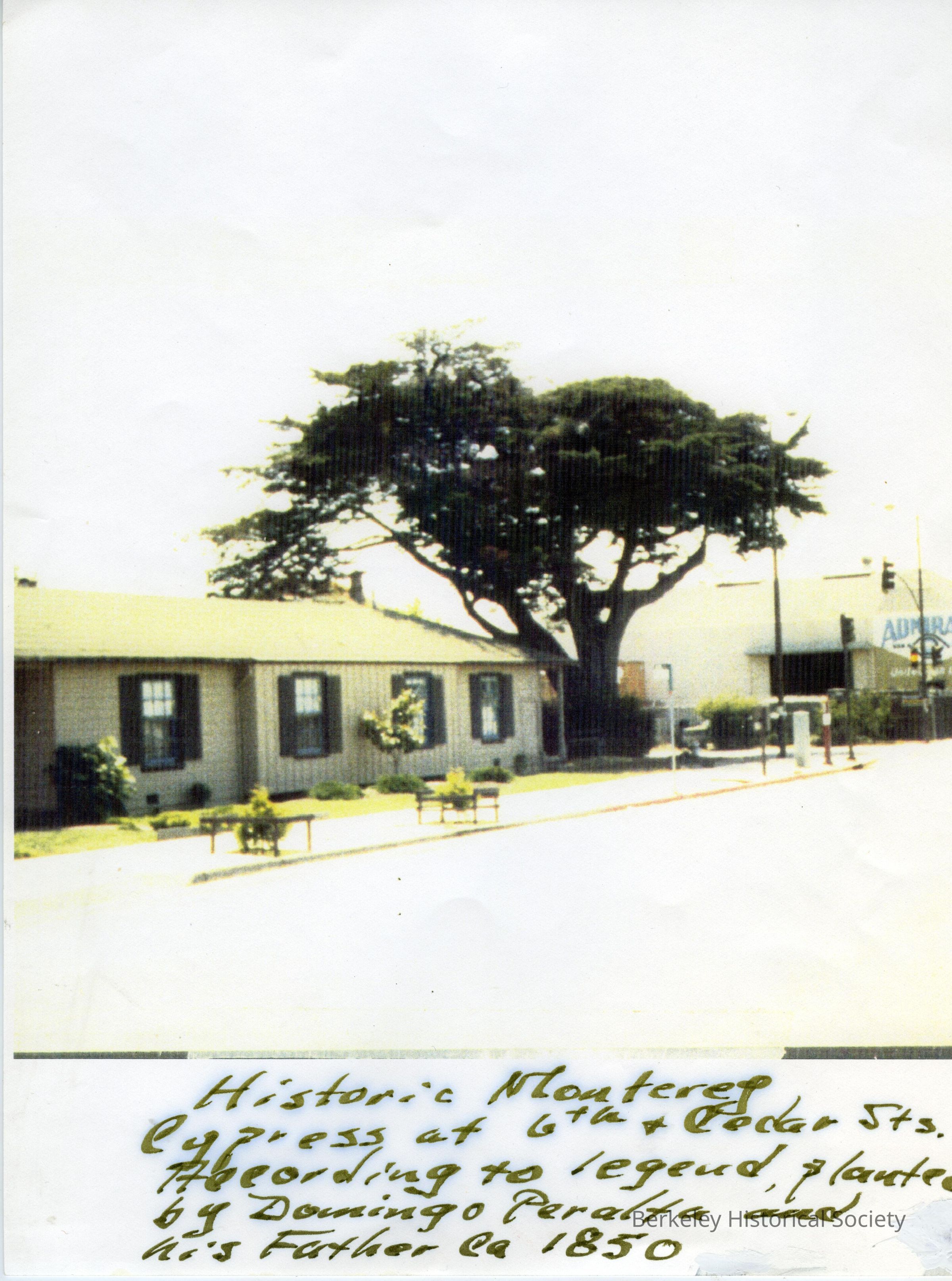 Tree supposedly planted by Domingo Peralta and his father about 1950. Located at 6th and Cedar Streets. Legend at bottom of photo.Other Names and Numbers