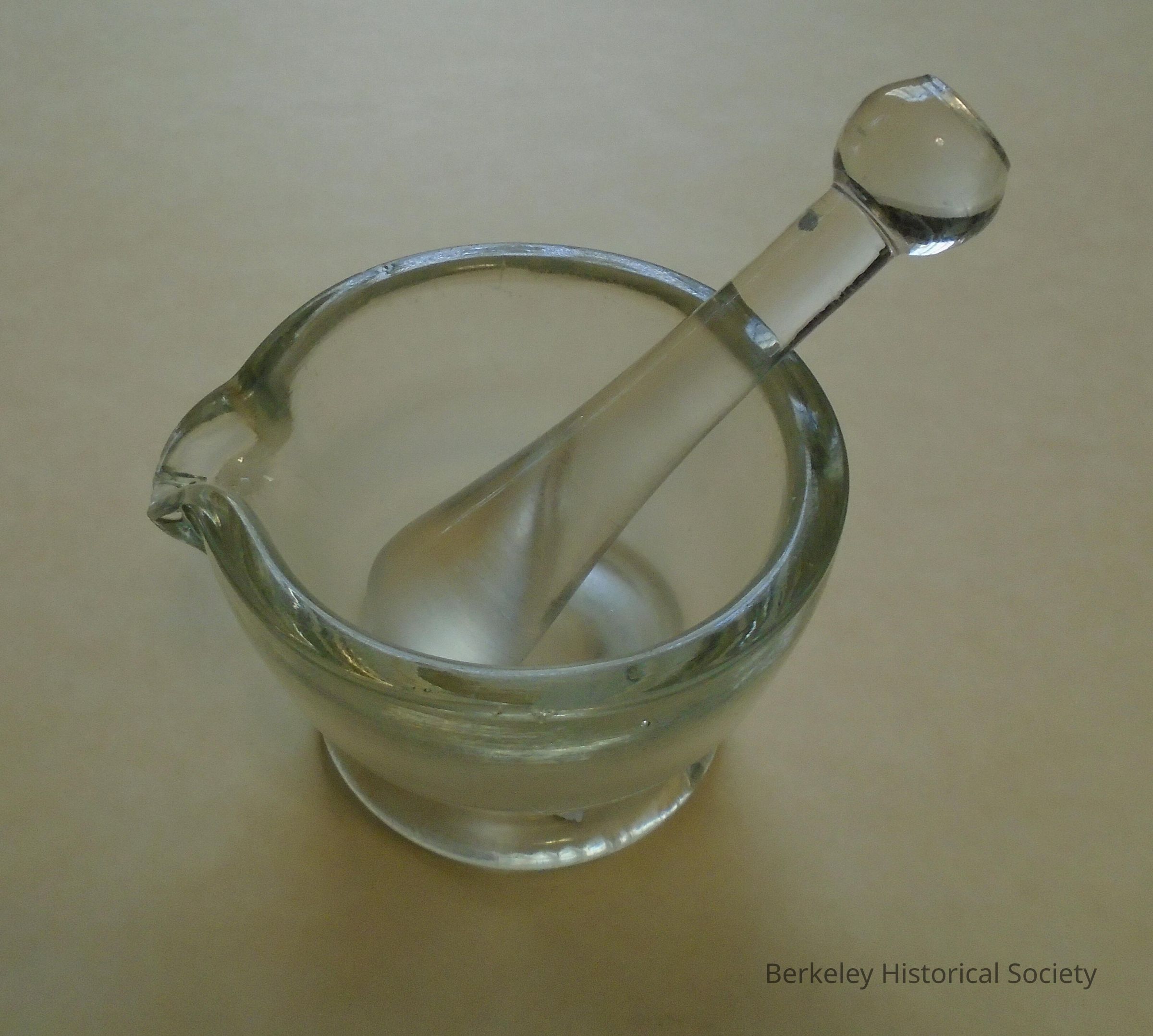 Clear, glass mortar and pestle belonging to Dr. James E. Shafer., physician and surgeon. He lived at 2815 Woolsey St. and had an office at 2162 Center St.