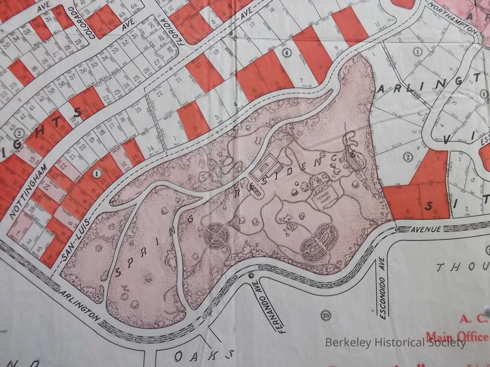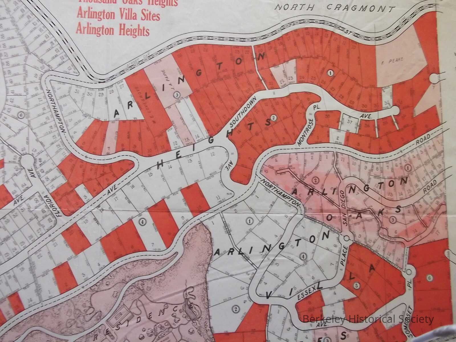 Tract map including Thousand Oaks Heights, Arlington Heights, Arlington Villa, The Most Beautiful, Marine View Property in California. Berkeley Thousand Oaks Realty, adjacent to Berkeley Highlands, North Cragmont, Berkeley Square, Thousand Oaks Court, Take Southern Pacific Electric, Shattuck, California Street Loop or Ninth Street Loop Cars to end of line. Lots sold marked in Red