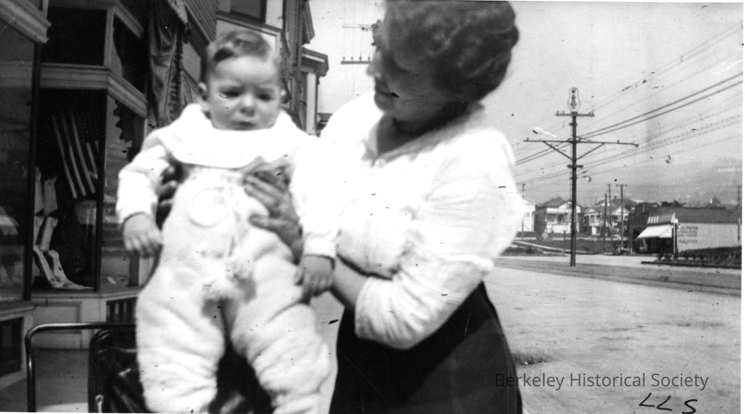 Mother and baby, Shattuck Ave. Note: Blacksmith Shop in distance, Geo. Reed & Geo. Moore.