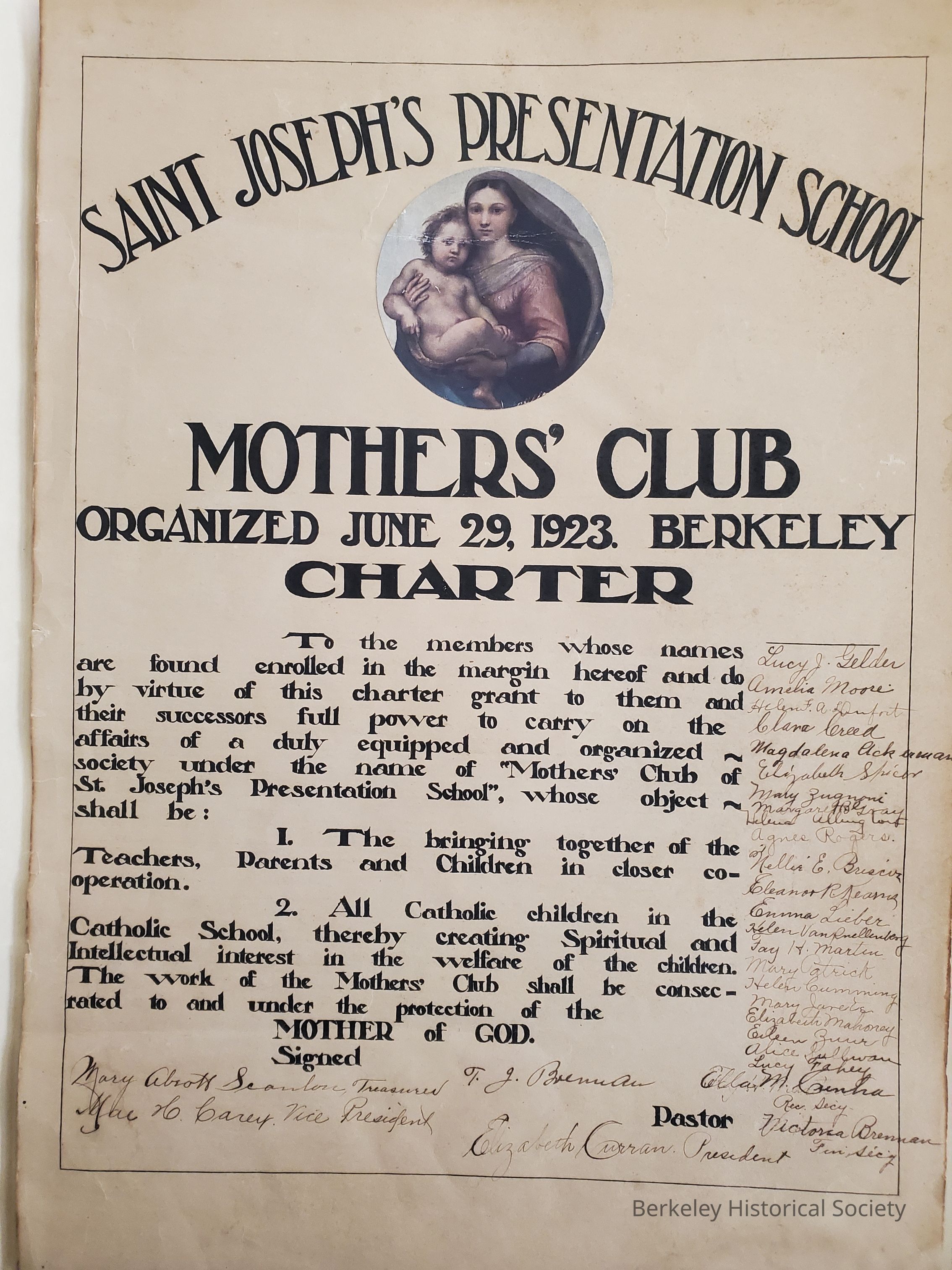 Charter of the Mothers' Club. Hand lettered, with signatures of members, officers. and church pastor.
