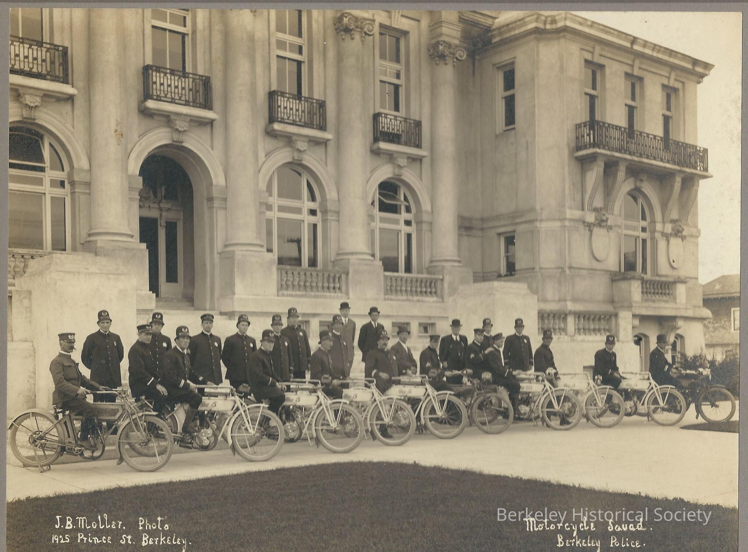 Row of policemen on motorcycles, with other police and officials standing behind them, in front of Berkeley City Hall. Manuscript note on verso states that the motorcycles were sold to the police by A. J. Berthelsen, San Pablo Avenue, West Berkeley.Made/Created