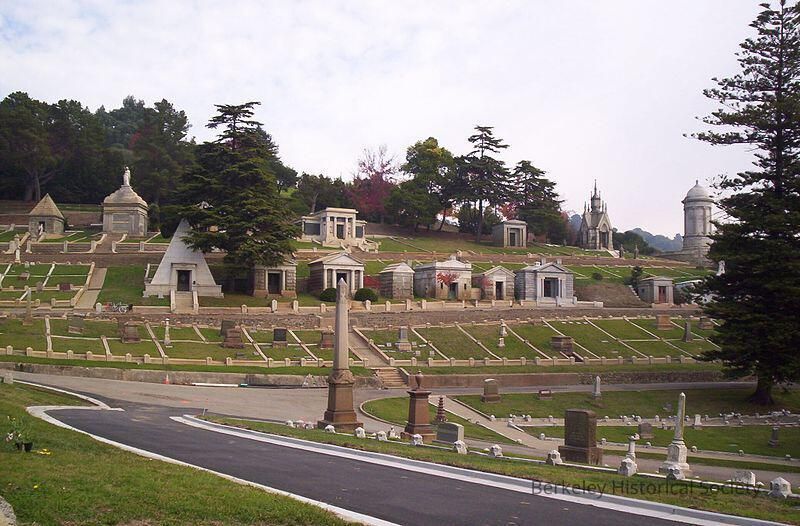 Color view of tombs of wealthy individuals, some of Berkeleyans. Names not legible.Lexicon