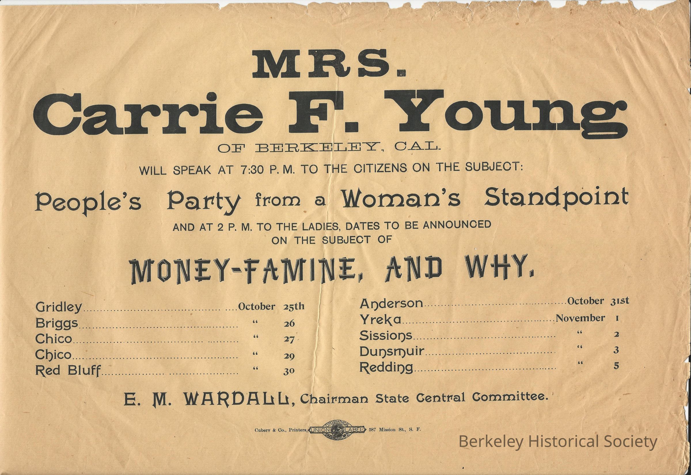 Broadside announcing speech: Mrs. Carrie F. Young.. will speak at 7:30 p.m. ... on the subject People's Party from a woman's standpoint.