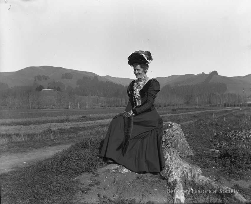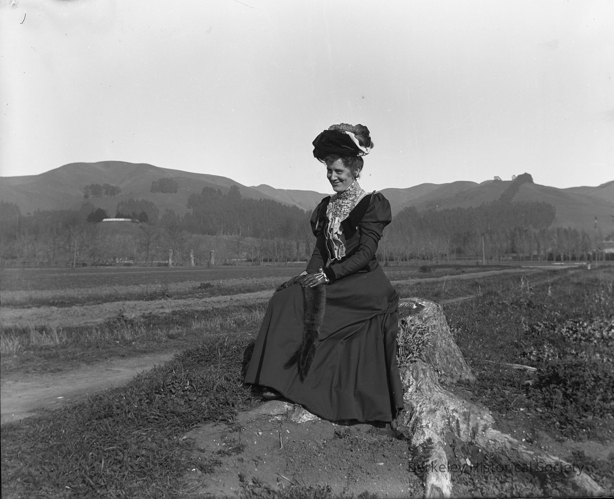 Mrs. Post sitting on a tree stump at the undeveloped intersetion of Telegraph and Ashby, circa 1900. This image is a photocopy of a photograph from a glass negative.