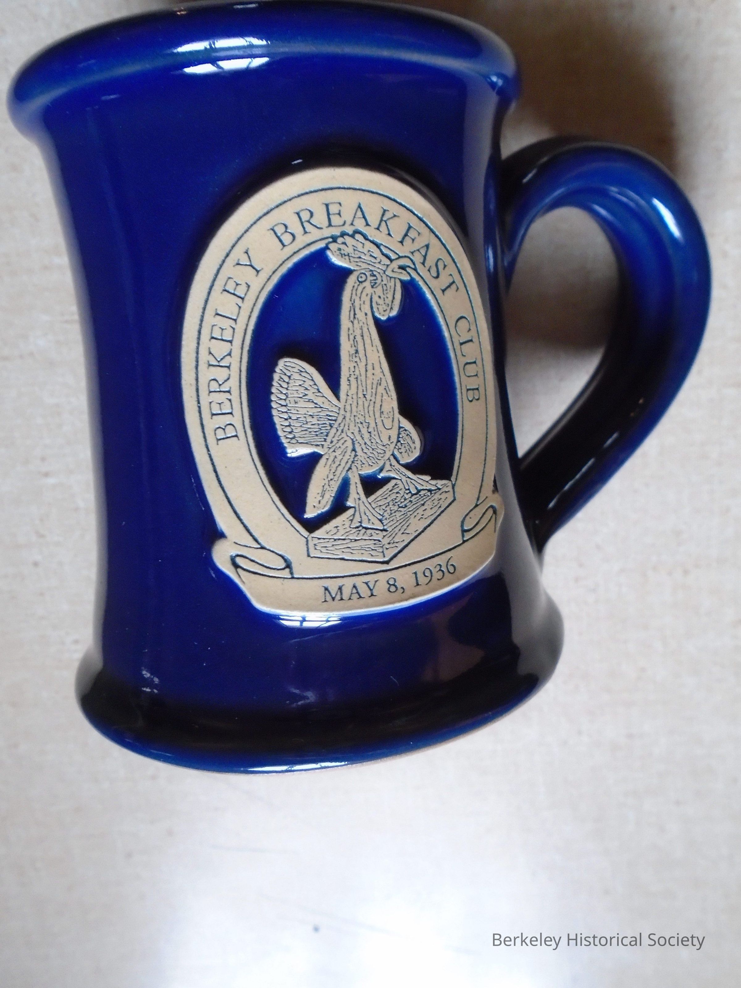 Blue pottery mug with (rooster) logo of Berkeley Breakfast Club, May 8, 1936. Imprinted on the bottom: DENEEN POTTERY.COM. Handmade USA dishwasher & microwave safe.Made/Created