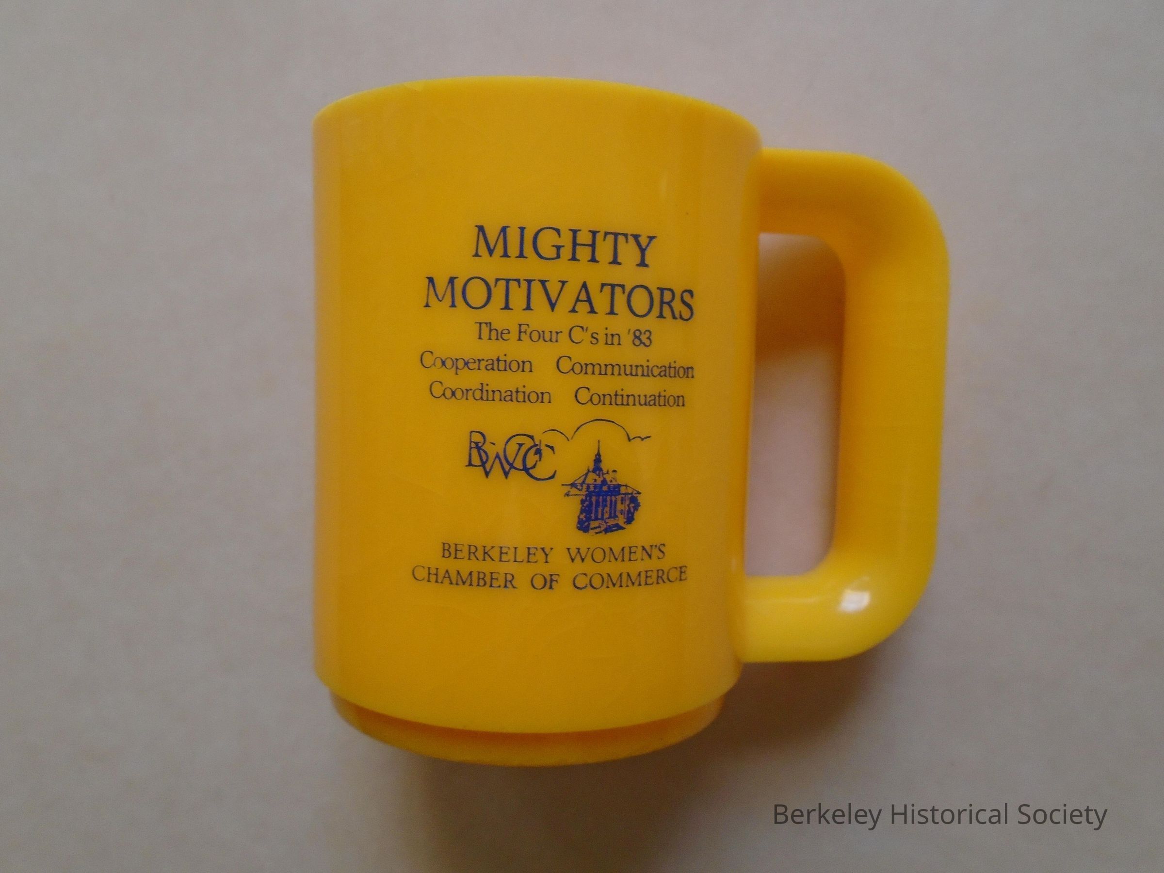 Plastic, yellow/gold mug with handle. Blue printing on side: " Berkeley Women's Chamber of Commerce, BWC " and logo. "Mighty Motivators, The Four C's in '83, Cooperation, Communication, Coordination, Continuation".Made/Created