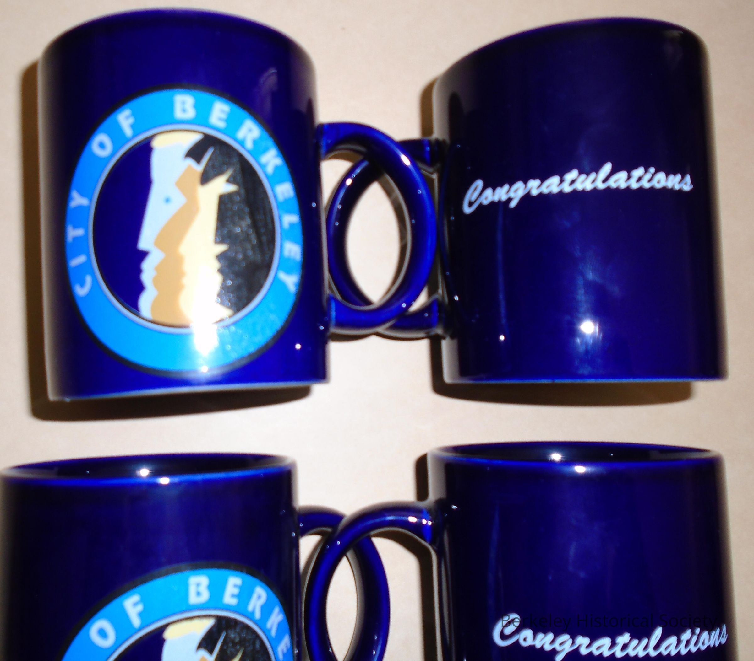 Set of 4 ceramic mugs, black with "City of Berkeley" and Berkeley logo on one side and "Congratulations" on the other.