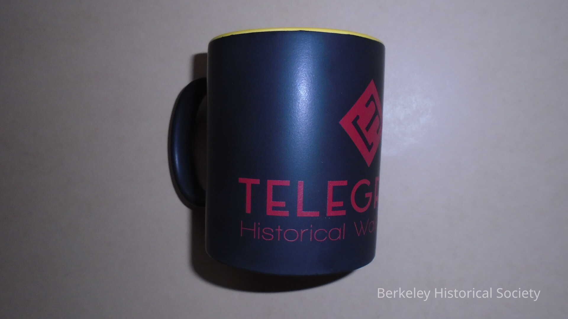 Porcelain mug. Black matte finish outside, glossy yellow inside. Square logo and "Telegraph Historical Walking Tour" in red.