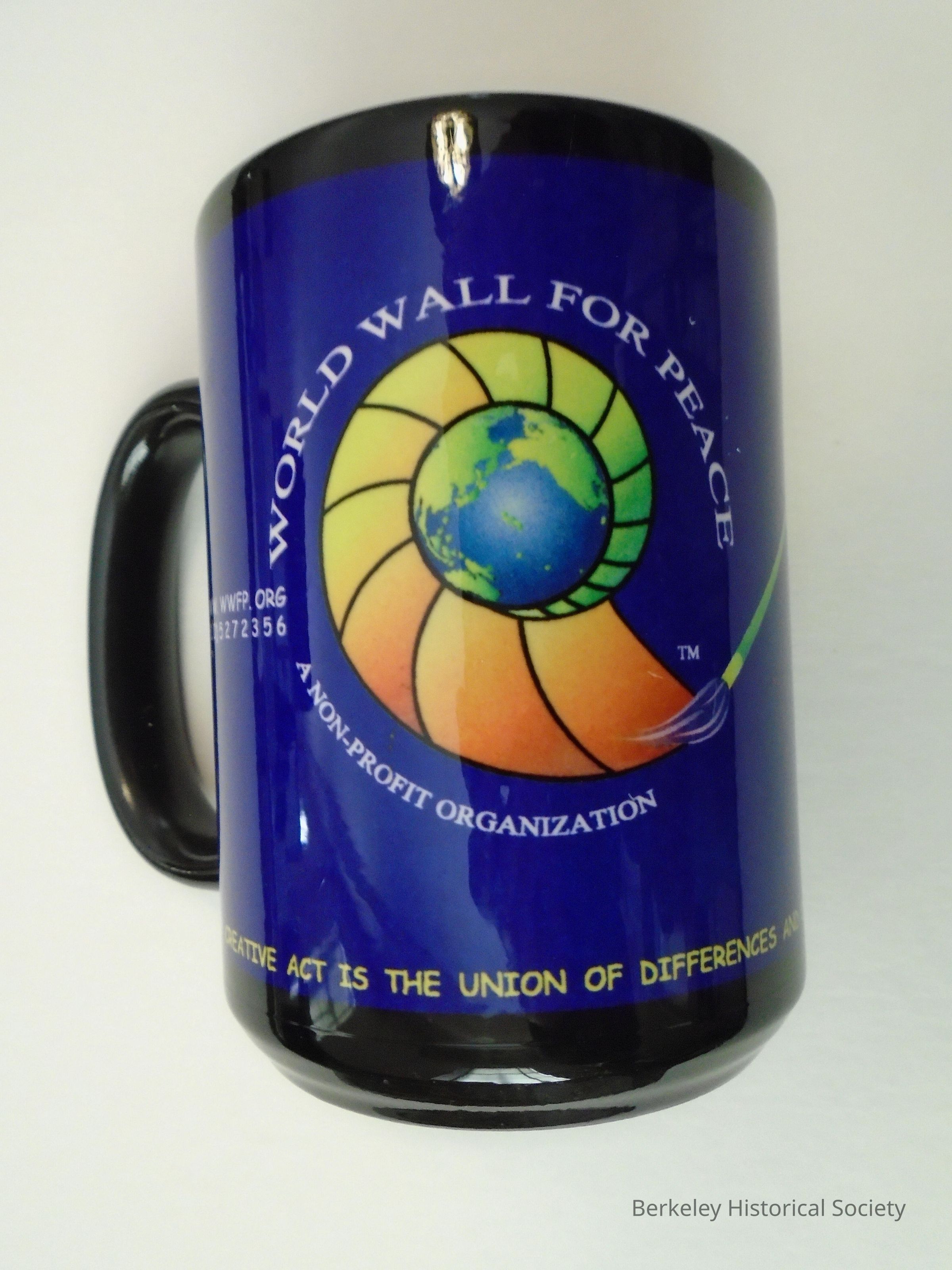 Blue, ceramic mug, with logo (globe of earth in the shape of a conch, with paintbrush) and "WORLD WALL FOR PEACE , a non-profit organization. www.wwfp.org 510-527-2356." (Peace wall is in Civic Center Park. ) . "Every creative act is the union of differences and opposites. Diversity is the heart of creativity. " Bottom of mug shows made in Thailand.Made/Created